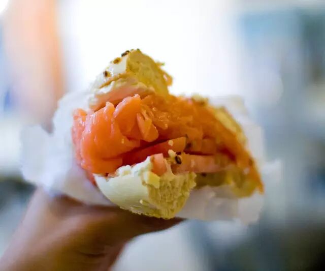 在纽约,可以吃bagel做早餐,中间夹着熏三文鱼、洋葱和cream cheese。据说H&H和Ess-A-Bagel是比较受欢迎的两家bagel店。