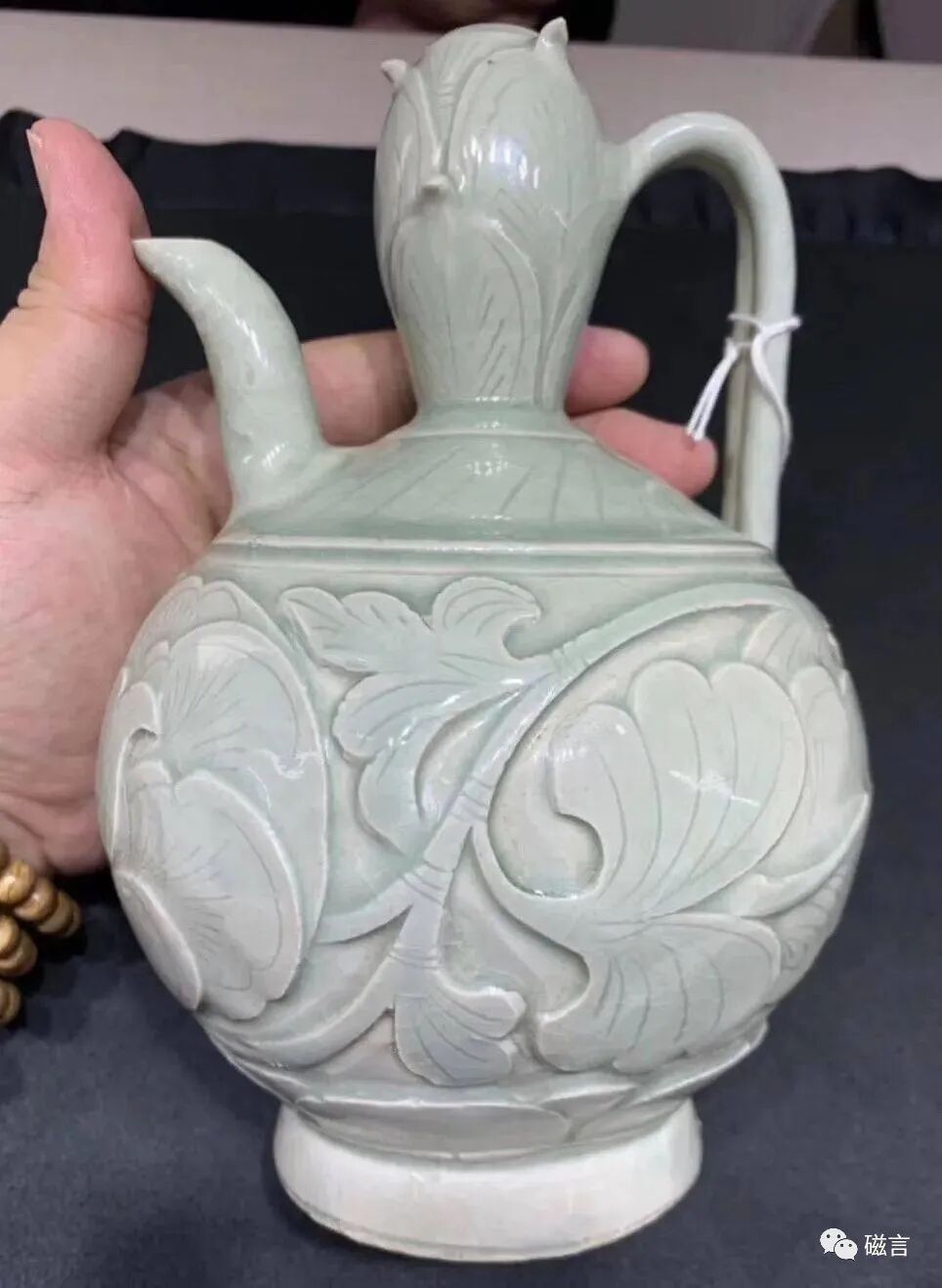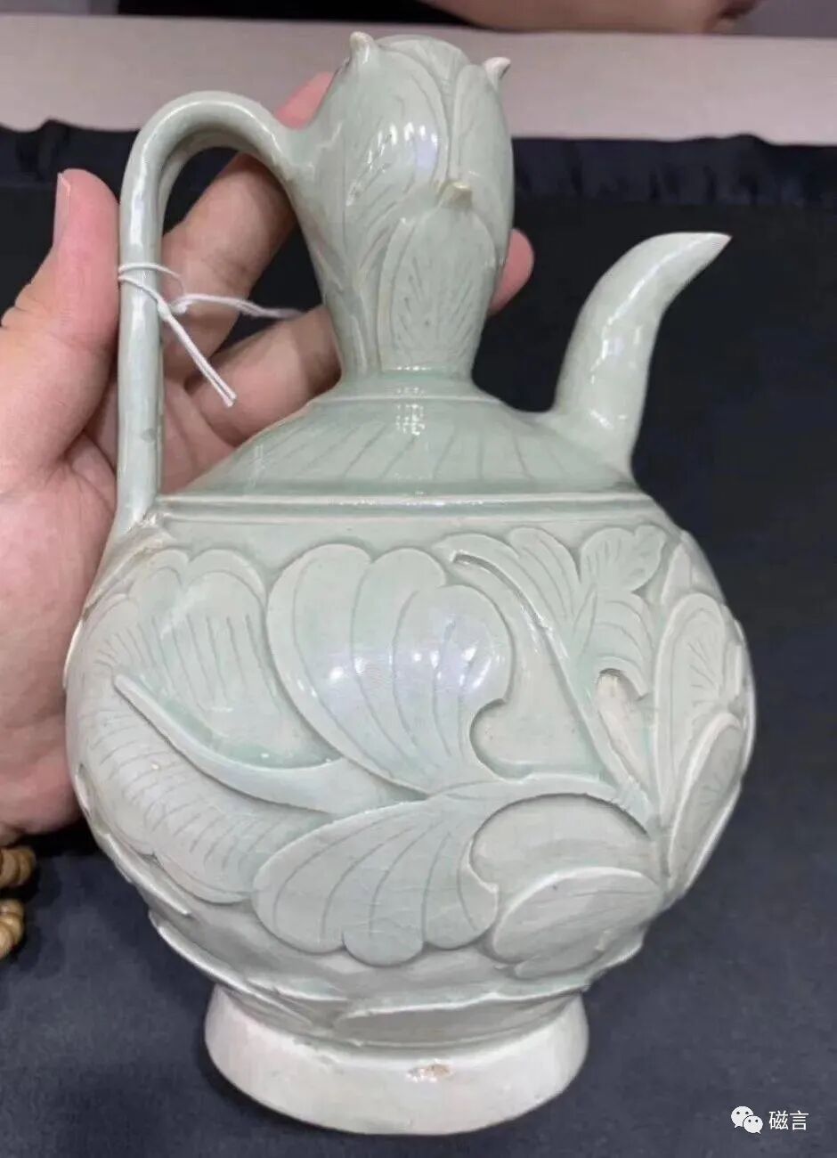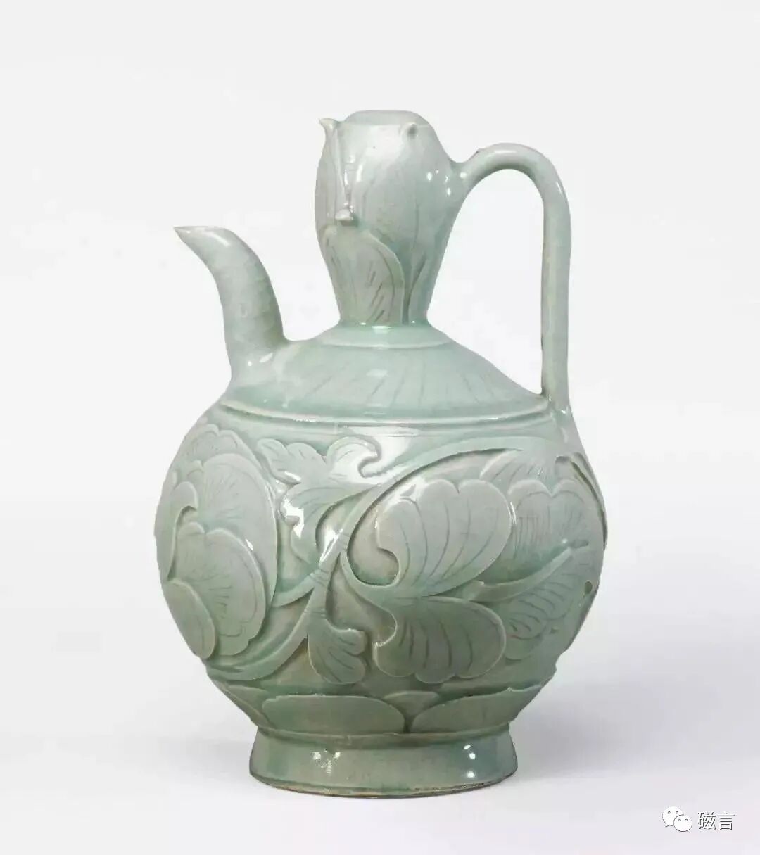 此壶小口,口沿似玉璧,壶身呈梨形,肩部一侧开短流,流身略微弯曲,斜口,便于出水而不滴洒。肩部另一侧粘烧环柄,柄身作U字形。肩部刻饰覆莲花瓣。壶身刻连枝牡丹纹,牡丹或垂或仰,用刀深峻斜出,得花肥叶厚之感。花瓣之上再以竹篦刻划经络,随意而到位,不着匠气。圈足及底部刮釉,胎骨灰白致密。壶身内外通施青釉,釉色青郁。关注公众号:磁言。此壶细节处,如壶口、壶把,皆不失精巧匠意。