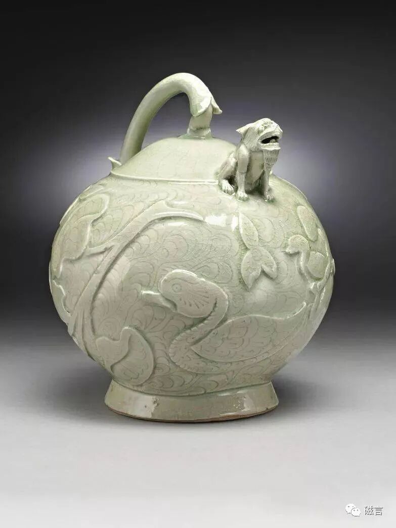这类五代至北宋的耀州浮雕风格的壶,在拍卖中的成绩都很好,壶没有盖,从整体结构来看,应该是需要从壶底注水,从狮流出水的耀州窑魔壶——倒流壶。
