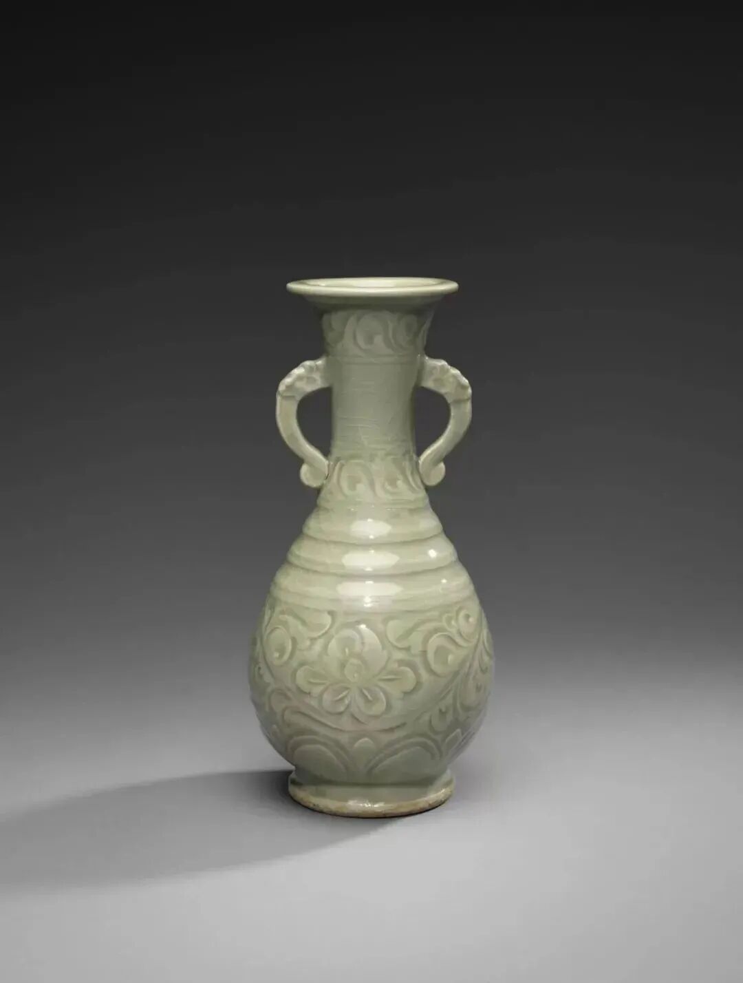 北宋 耀州窑青釉刻牡丹花双耳瓶