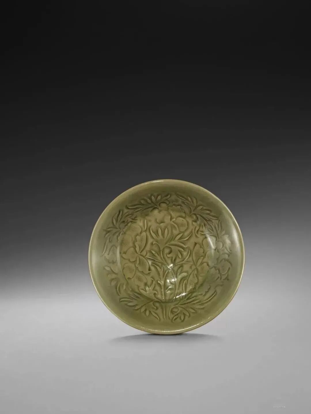 盘敞口,薄唇,斜弧腹略深,浅圈足,足心微凸。通身施橄榄绿釉,盘内刻划一朵折枝牡丹花,花瓣肥硕,纹饰布局有序,运刀流畅,线条刚劲有力,花叶具有强烈立体感。整器胎体坚实,釉色润泽,色彩雅致,秀丽大方,为北宋耀州窑经典作品。