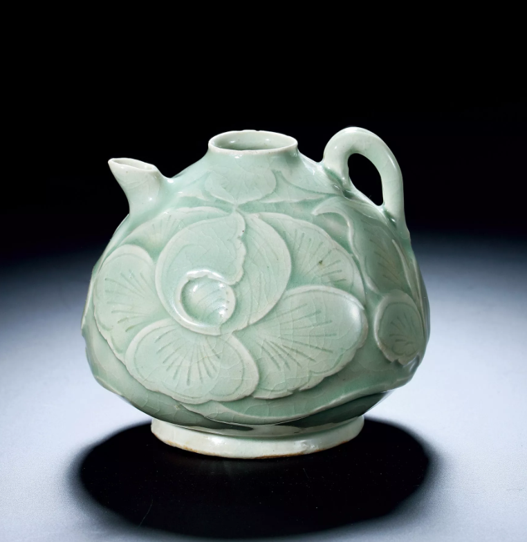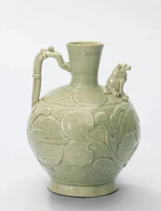 这件2007年成交的北宋耀州窑执壶,最特别指出在于其葫芦造型,和青绿的釉色。瓶口还有逼真的花苞造型,充分展现的耀州窑匠人塑形能力。