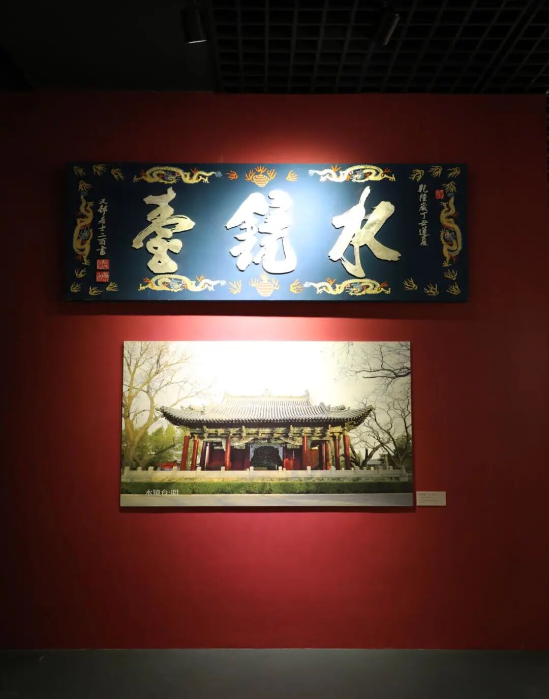 “水镜台”这块匾挂在进入晋祠大门的第一座古建筑——水镜台上。水镜台是一座明代戏台,集楼、台、殿、阁四种建筑风格于一体,前部为单檐卷棚顶,后部是重檐歇山顶,台周围有疏朗的走廊。此台造型雄奇,雕刻彩绘精细。戏台正中央悬挂的“水镜台”匾,是清乾隆年间翰林院编修晋祠人杨二酉所书,为晋祠三大名匾之一,被誉为“秀丽之笔”。“水镜”语出《前汉书韩安国传》:“清水明镜,不可以形逃”的句子,意思是忠奸是非尽人皆知。