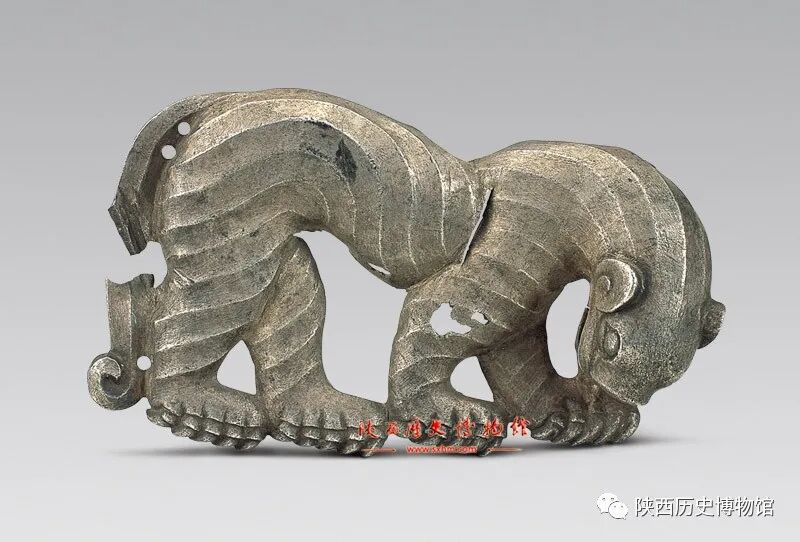 现藏于陕西历史博物馆的这件银虎于1957年出土于陕西省神木县纳林高兔村匈奴墓,同出的还有三件银虎、两件金虎。银虎为浇铸成型的浮雕式装饰,头部近似圆雕,转颈低俯,舔舐前爪。身躯上有瓦棱状条纹。颈部有一个圆孔,尾部也有三个圆孔,应是穿缀或铆钉所用。头部低俯的造型及四肢粗壮、爪趾发达的外形则表达出了猛兽充满力量的特点。
