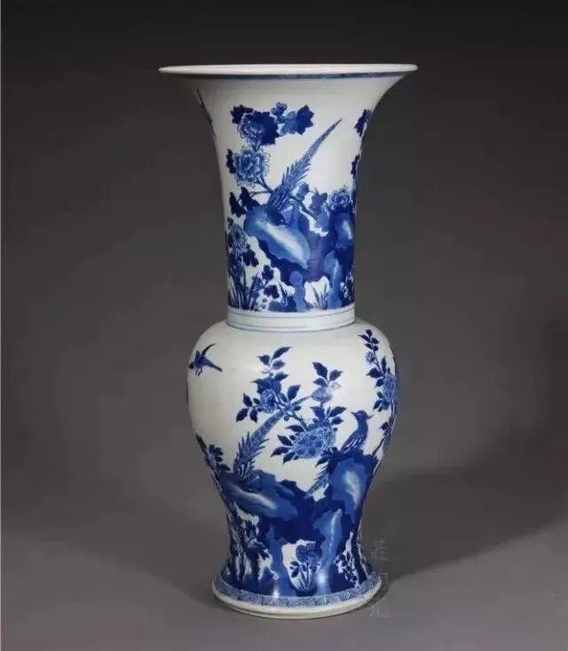 造型,顺治时期的青花瓷器具有明显的明代遗风,常见的包括简瓶、筒花觚、将军罐以及钵式香炉,其中筒瓶造型从万历年间出现,口底相若,直腹,器口施酱釉,寓意为“大清天下一统”;筒花觚口底相若,平底无釉,多为出土将军罐多为佛教僧侣盛殓骨灰之器;将军罐直口封丰肩,平底无釉,于嘉靖、万历时期出现,顺治时期形成定式;钵式香炉器型丰满,平底无釉,属佛前供器。