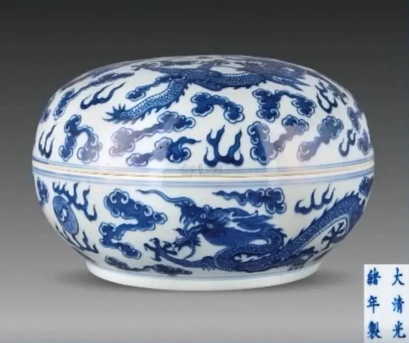 宣统皇帝,在位时间较短,传世品数量较少,该时期的胎体较薄,胎质坚致,瓷化程度高,釉面匀净,釉色为纯白色,施釉较薄,而且主要以传统造型为主,多为海水异兽纹、八卦等纹饰,绘画精致,以楷款为主。
