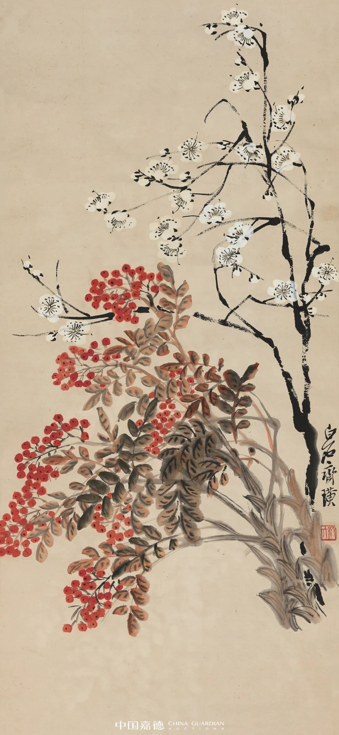齐白石的虾堪称画坛一绝,其实他画的梅花也独树一帜。齐白石喜欢画梅,他曾在一幅梅花图上题诗:“小驿孤城旧梦荒,花开花落事寻常。蹇驴残雪寒吹笛,只有梅花解我狂。”齐白石爱梅,不仅因其高洁不群,更因为梅花寄托着他对故园的回忆。齐白石在他的《自述》中写道:“莲花塘离余霞岭,有二十来里地,一望都是梅花,我把住的梅花祠,取名为百梅书屋。我做过一首诗,说:‘最关情是旧移家,屋角寒风香径斜,二十里中三尺雪,余霞双屐到莲花。’梅公祠边,梅花之外,还有很多木芙蓉,花开时好像铺着一大片锦绣,好看得很。”家乡草木,心常念之。齐白石笔下的梅花,没有太多的冷艳孤清,反而在清新明亮、生机勃勃中透露出一丝人间烟火的暖意,那是时空变迁之后清澈而绵延的回忆,也是对大自然诗意核心的领悟。