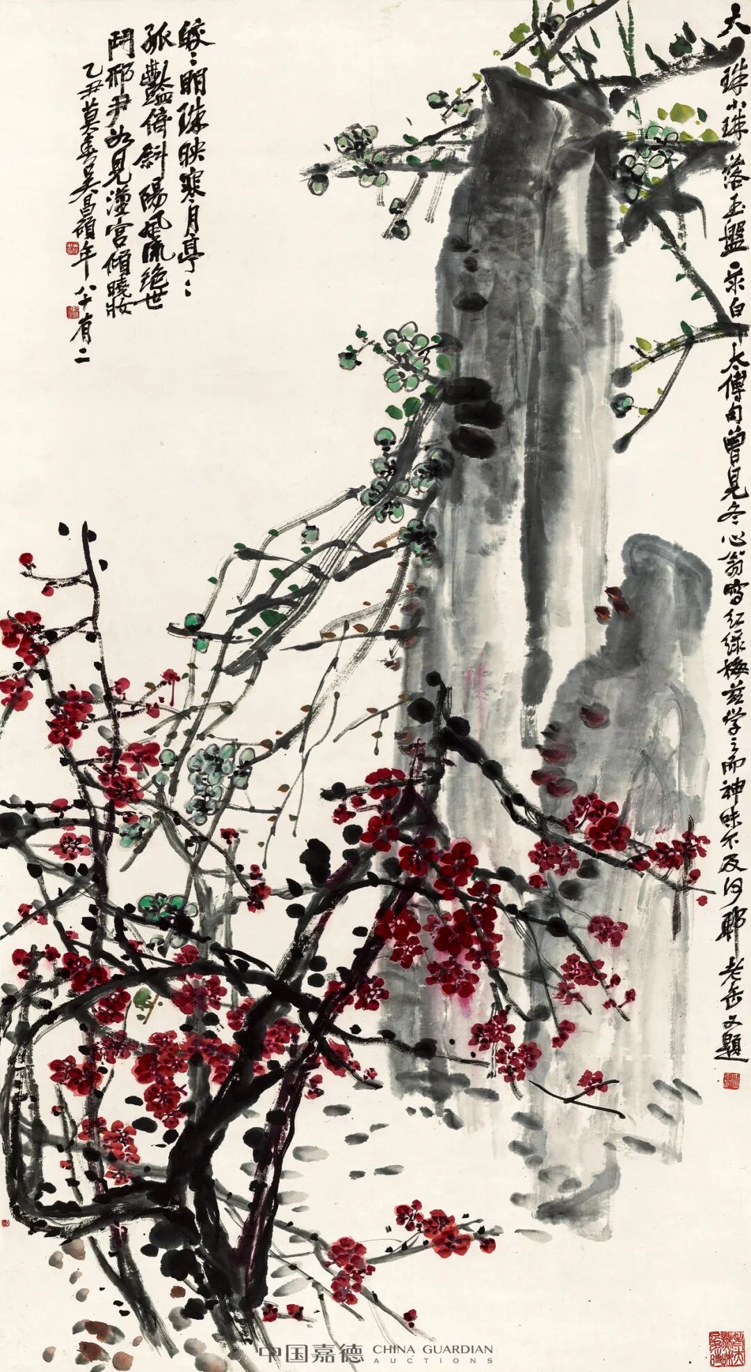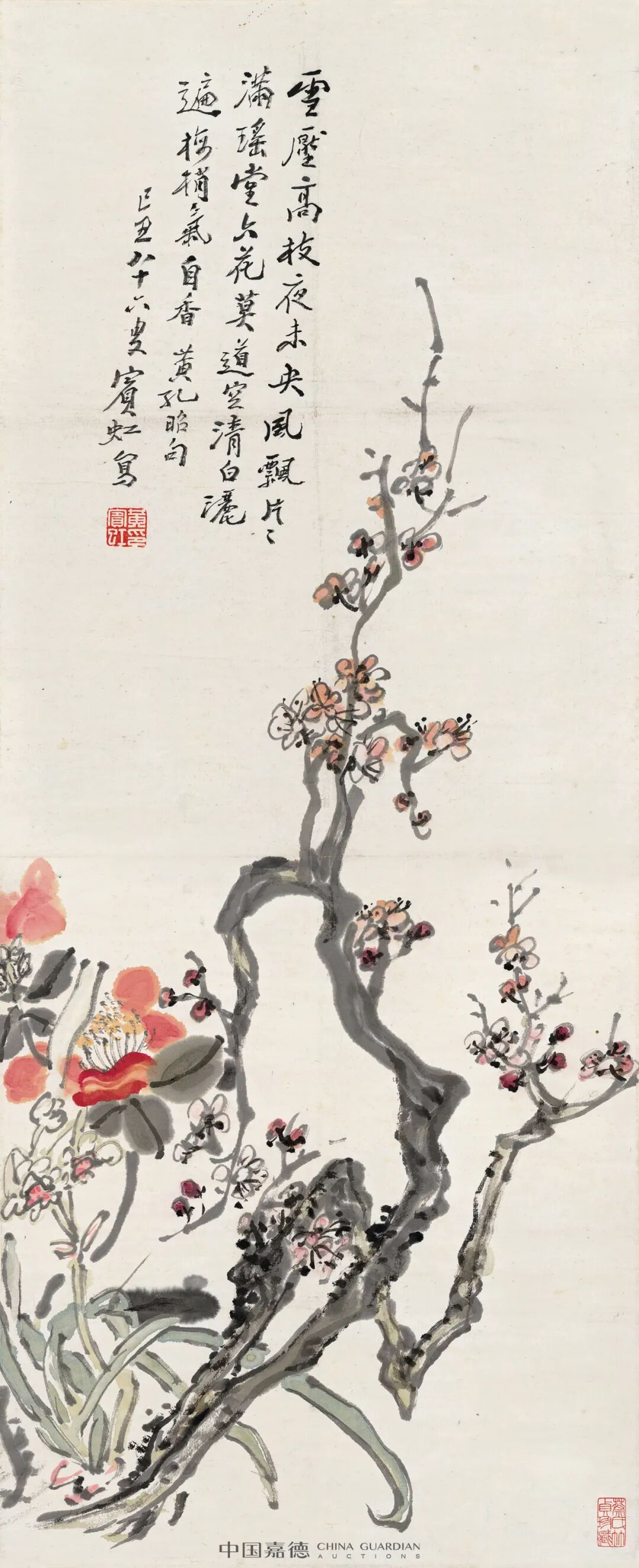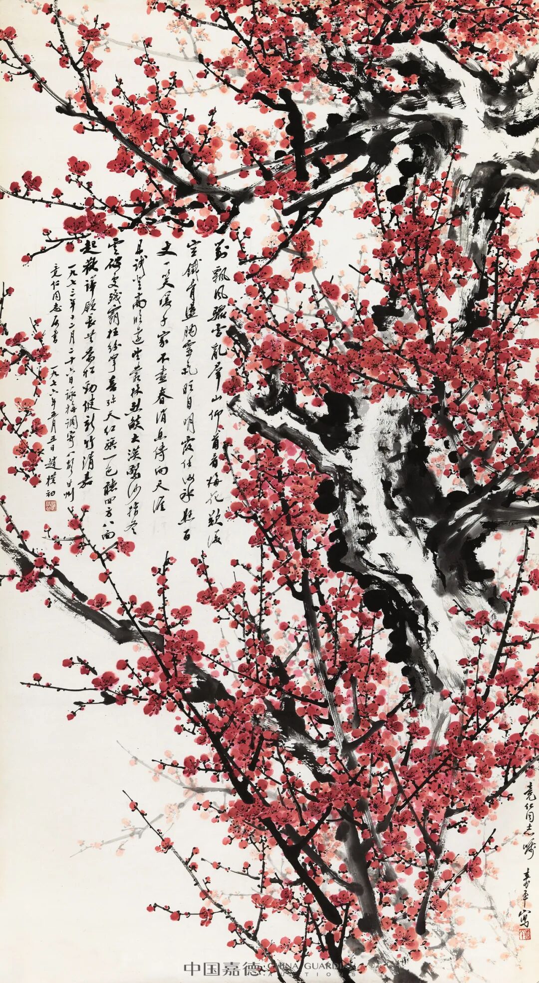 董寿平以擅画梅花修竹而名扬宇内,所绘作品被誉为“董梅”“董竹”。在董寿平的创作生涯中,画梅从20世纪30年代持续到逝世前一年。他笔下的梅花往往三两枝杈,线条骨力强劲,浓淡有致,干湿合度,富有层次,充分表现出梅花之高洁馨香。他笔下的朱砂红梅尤其堪称绝技,留下了用半斤朱砂画梅的传说。