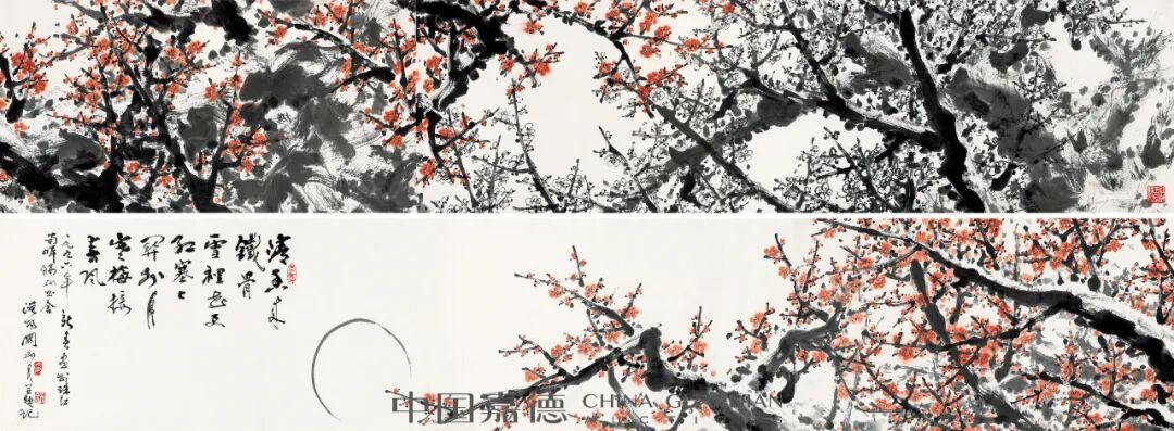 他笔下的梅花注重气势,捭阖纵放,疏密有致,焦墨枯笔,曲直苍劲,时而如探水揽月,时而如凌空飞去,姿态各异,淡蕊披离,郁郁苍苍,清逸拔俗。