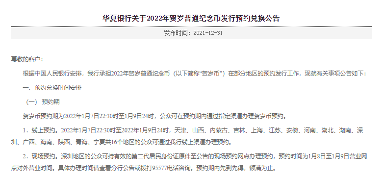 虎年纪念币,可在华夏银行的微信端、电脑端、APP上进行预约,预约入口如下: