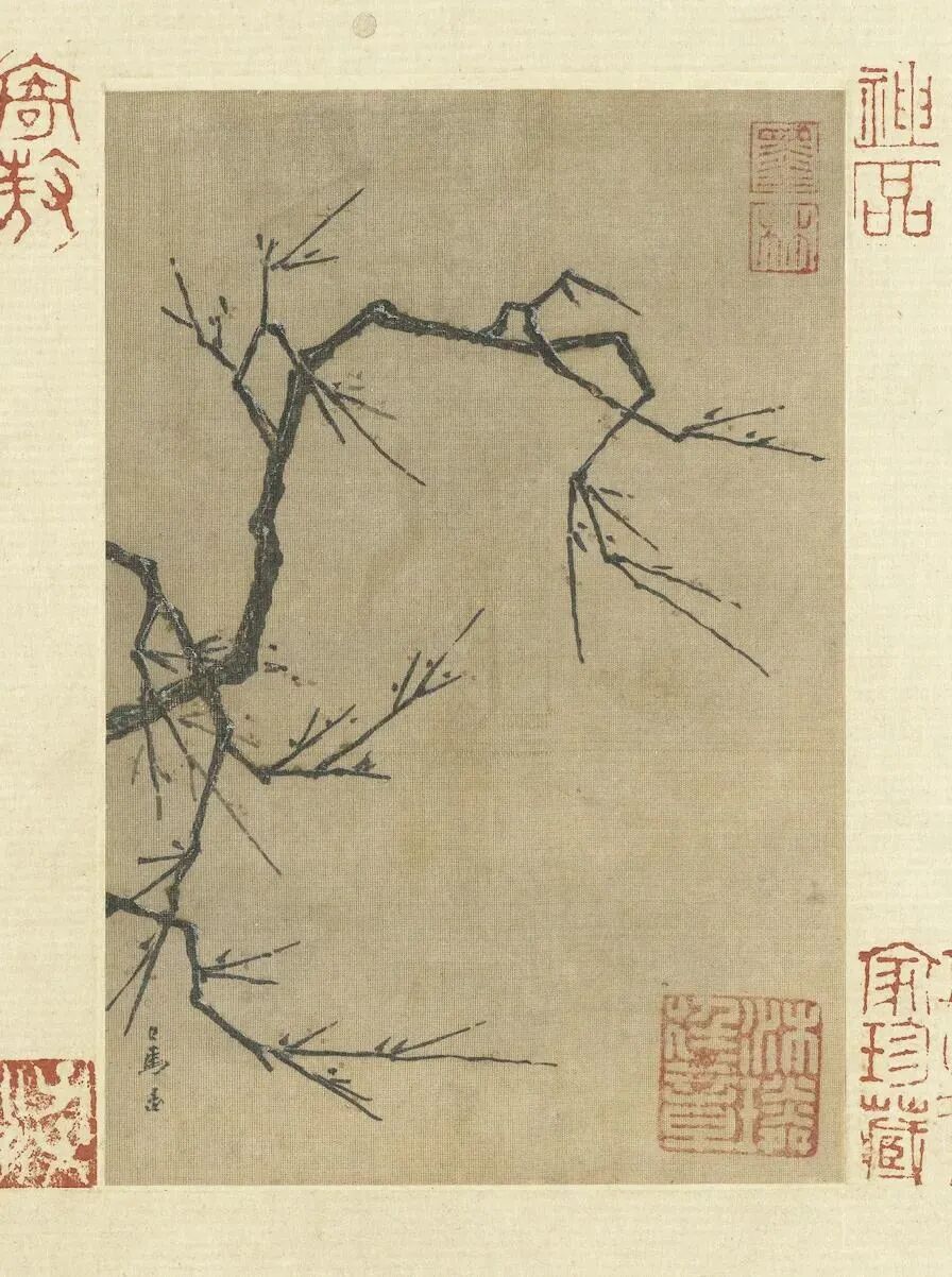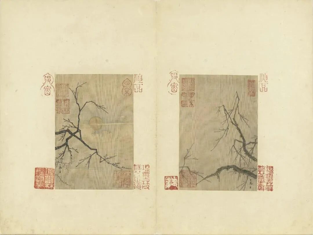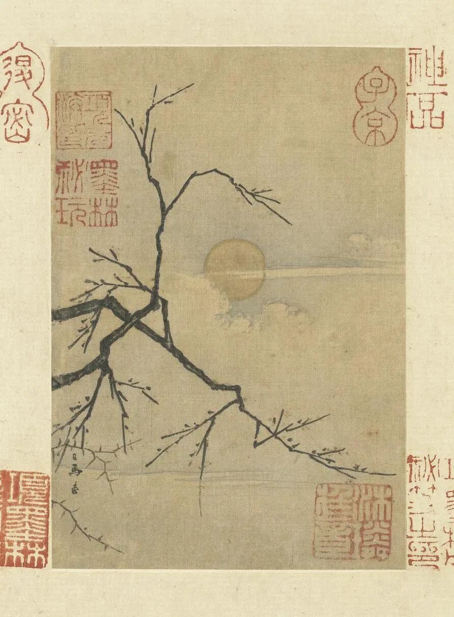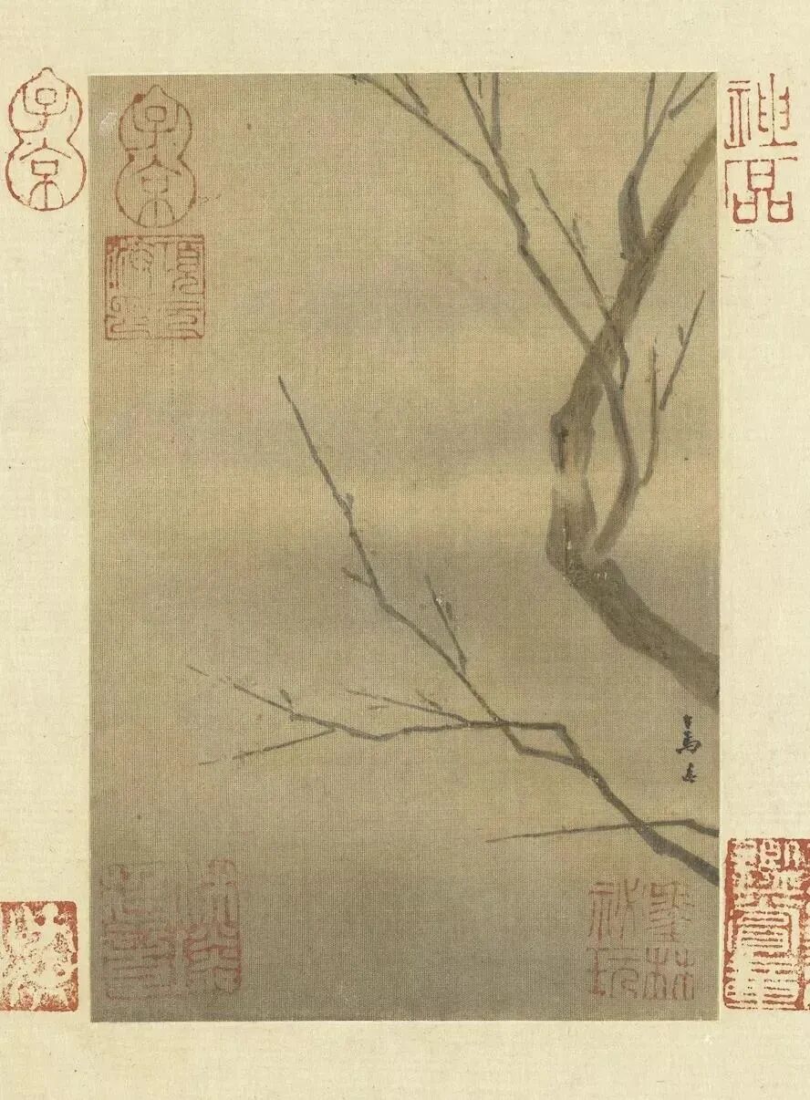 台北故宫藏马远梅花小品册共六幅,画心14.2x9.5cm,大小差不多与手机屏幕一般大。马远擅于截取自然中的片段小景,放在广阔空间的一角加以描绘,以峭拔简括见长,下笔遒劲严峻,设色清润,人称之为“马一角”。