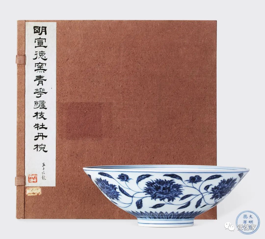 敞口、宽口沿、浅腹、圈足。外壁以青花绘缠枝芍药纹,细小纹饰处采用一笔勾成的画法。腹壁共计六朵同花同向,花朵饱满圆润,花心状如葫芦,花瓣托苞。主枝为波浪形缠绕往复,小片花叶穿插其间,勾勒填色中有深浅变化。近足处为莲瓣纹饰,足壁绘以单线条装饰,内壁素白,碗心绘双圈朵花纹。青花发色浓深,底足平削,底款双圈六字“大明宣德年制”楷书款。