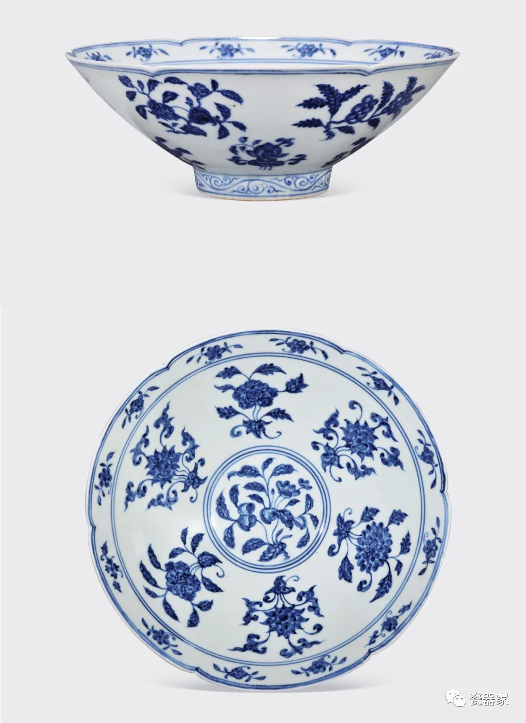 本品为宣德窑业兴盛之佳例,为六瓣葵口式,斗笠形,沿袭宋瓷定窑、官窑之式;造型别致,自见赵宋洗练简约之美,尽显曲线变化之佳妙,造型似仿自汝官宋器。胎质细腻坚致,釉汁莹润亮青,全器内外纹饰疏朗而饱满,外壁装饰两重纹样,上为六组折枝瑞果纹,下为六组折枝花卉纹,交错布置,内壁口沿缀饰十二式花果纹,下承六组折枝花卉纹与外壁纹饰相对应,碗心则是绘以折枝寿桃纹。祥花瑞果是永宣青花最为经典的纹饰,本品涵括了所见的主要品类,祥花如菊花、牡丹、莲花、茶花,瑞果如蟠桃、枇杷、荔枝、石榴、葡萄、樱桃。其绘画写实逼真,诸花妍放生姿,众果饱满诱人,充分借鉴国画的笔墨意韵,得其法度,勾、勒、点、染诸法,运用皆宜。线条粗细并用,青料浓淡兼施,从而令画面富具苍翠欲滴的意趣,透出凝重雄浑之美。底部浅圈足,胎骨细腻,露胎处微微泛黄,抚之光润如玉。底落青花“大明宣德年制”楷书款,朴拙苍健,古意盎然。
