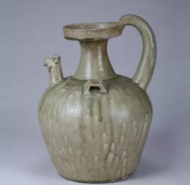 盘口,短颈,溜肩,鼓腹,平底。肩一侧置一短颈鸡首流,鸡冠挺立,流与壶身相通,可实用。另一则口、肩之间置圆股形曲柄。流与柄之间贴塑对称二横式桥形耳。肩部饰两道凹弦纹。内外施青釉,釉不到底。整体造型简洁,制作规整。2005年重庆市万州文管所调拨。