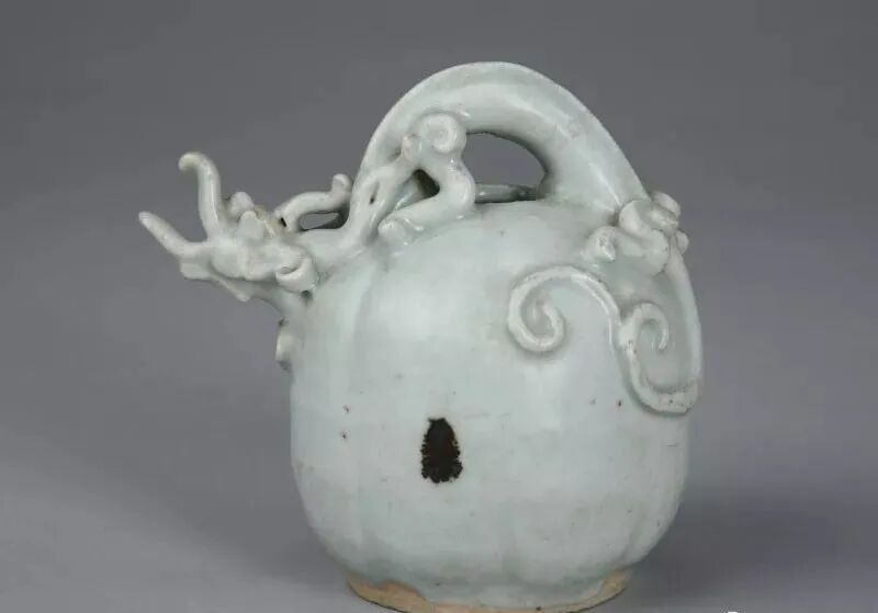 小口,壶体呈瓜棱球形,平底。泥塑昂首龙头作流,龙颈贴于壶身,龙身卷曲作提梁,肢尾鼓凸并贴于壶的上部,呈飞腾状。通体施青白釉,釉色白中泛青,腹上有一处铁锈斑,底无釉。造型独特,设计巧妙,为元代瓷器中实用性和艺术性相结合的完美器物,被收入《中国美术全集》。