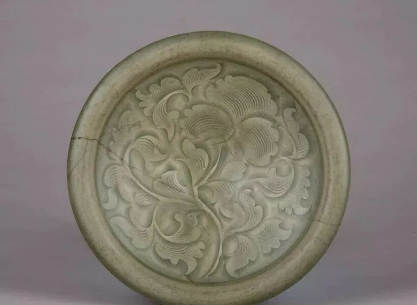 敞口,唇沿,浅弧腹,腹下急收呈矮圈足。通体施青釉,釉色青中微泛黄,小开片,底无釉。盘内满刻一枝盛开的牡丹花,线条流畅,纹饰清晰,立体感强,具有较强的艺术效果。