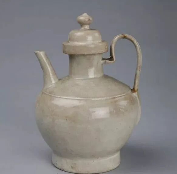 小口,直长颈,丰肩,球形腹,下腹内收呈高圈足。肩上一侧置长流朝上向外翘起,另一侧对称处置束带形曲柄。盖为高沿圆形,宝珠形纽。器施白釉,底无釉,白中泛黄。柄和肩各有一道弦纹。整体造型朴实大方,经济实用。据唐李匡义《资暇集》“注子偏提”条云:“元和初,酌酒犹樽杓。…居无何,稍用注子,其形若罂,而盖、嘴、柄皆具。”因执壶又称注子、注壶。