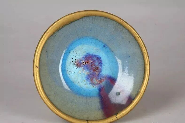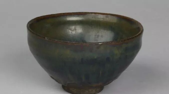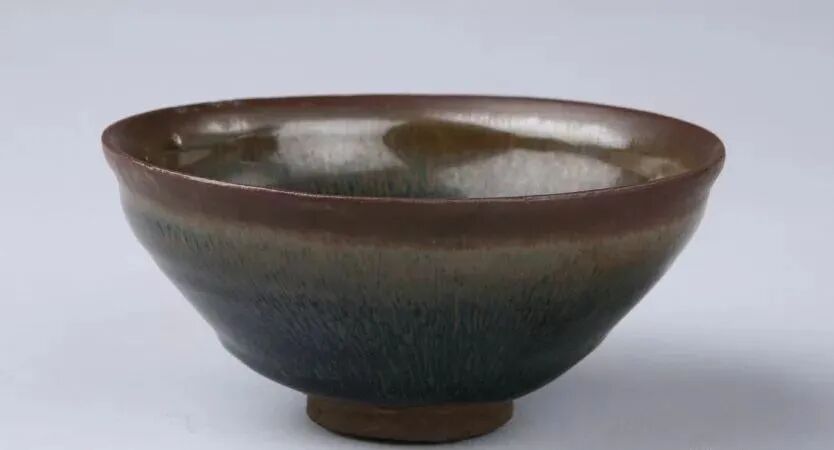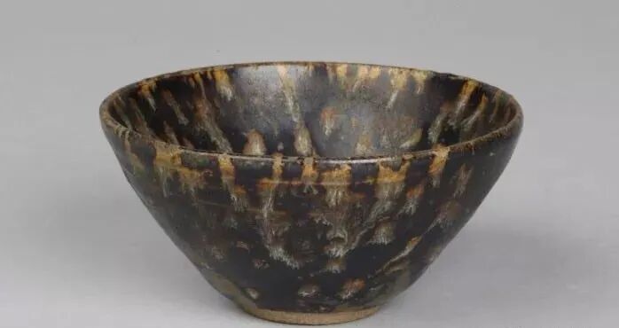 敞口,斜壁,小圈足。内外施釉呈铁黑色,圈足无釉,釉垂流至胫部。黑色釉面内布满褐黄色兔毫纹,闪现银灰色光泽。口沿外壁内凹一周,此盏适宜斗茶,因在饮茶兴盛的宋代为宫廷及上层人物所乐用。