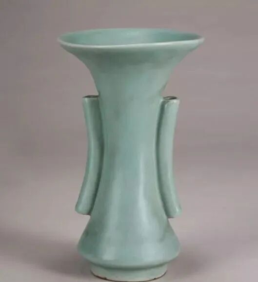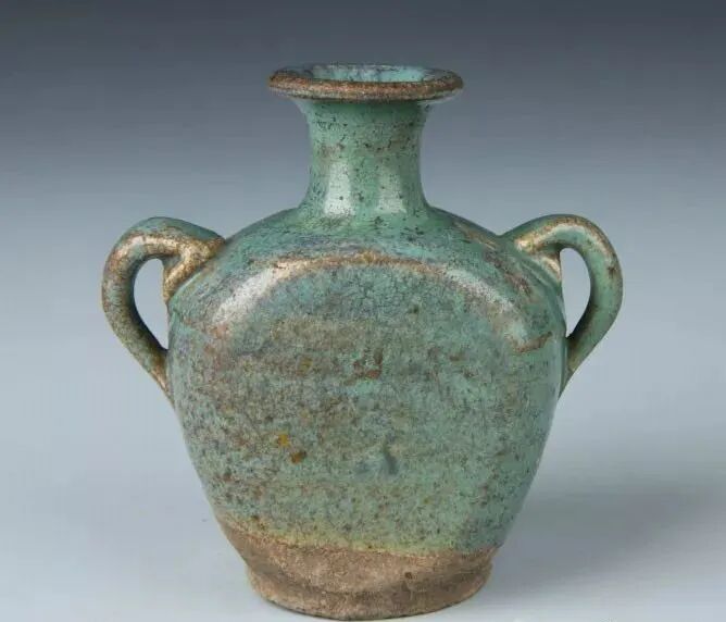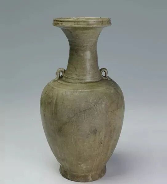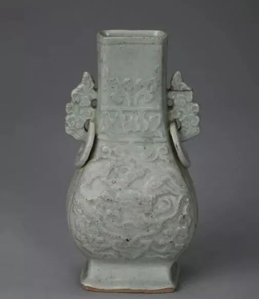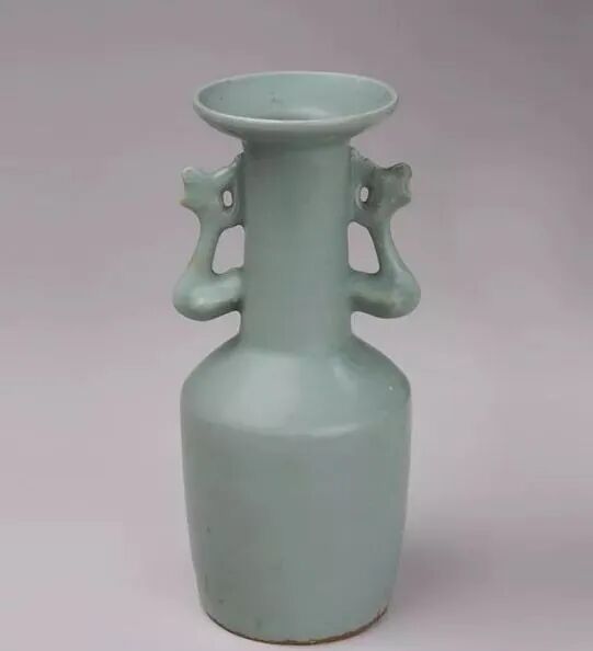 盘口,长颈,折肩,斜直腹,浅圈足。颈部两侧对称贴双凤耳,内外施青釉,底边无釉。口沿处釉层较薄,露出白色胎骨。其造型精美,端庄质朴,釉层厚而透明,釉面润泽,代表了龙泉窑青瓷最高水平。2005年重庆市开县文管所调拨。