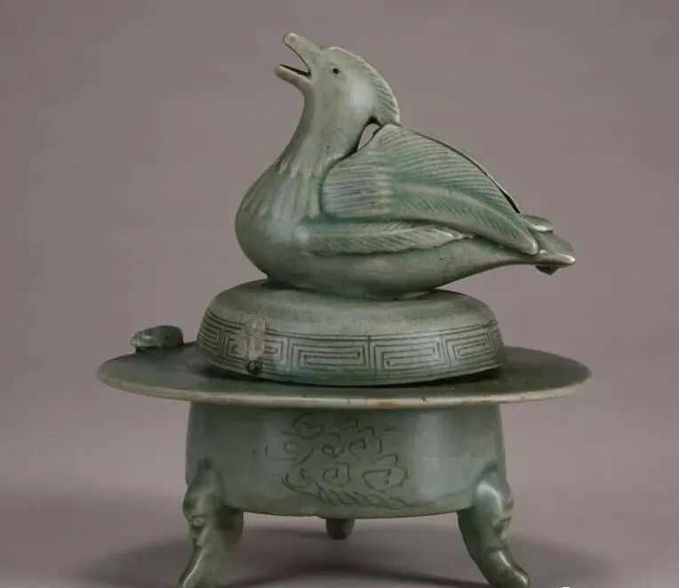 炉直口,宽折沿,直腹,平底。炉盖为覆缽形,字母口,平顶,钮为贴塑鸳鸯,张嘴朝上,为出烟口。盖沿刻划回纹一周。炉底承三兽形足,腹上刻三组折枝花卉纹。通体施青釉,青中泛黄,有细开片。造型设计巧妙,制作精细,器形新颖,式样优美,仿中国越窑青瓷。