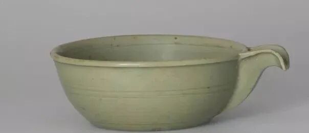 唇口,弧腹,平底。口一侧出槽呈流。胎质坚密,色灰白。内外施青釉,釉厚而透明,釉面润泽。内沿下方一周凹弦纹。外壁有不规则数圈凹弦纹。外底正中脐心施釉,外环一周不施釉。造型别致,淳朴厚实。2005年重庆市忠县文管所调拨。