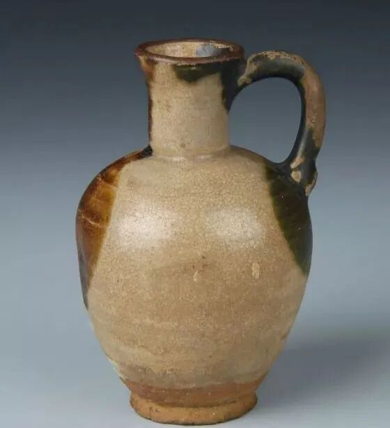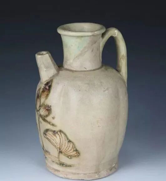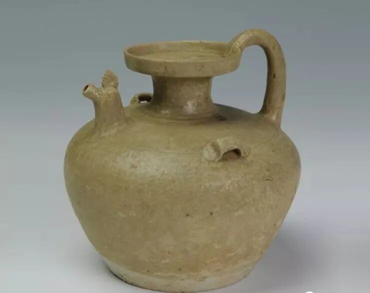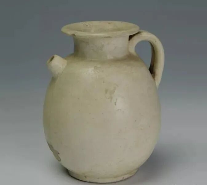 撇口,卷沿,短颈,溜肩,鼓腹,平底。肩上一侧置六棱短流,对称处置环形宽柄。通体施白釉,白中泛黄,釉不到底,釉色细腻、滋润、洁白。造型规整,腹部肥大饱满,体现了唐代人的审美情趣。