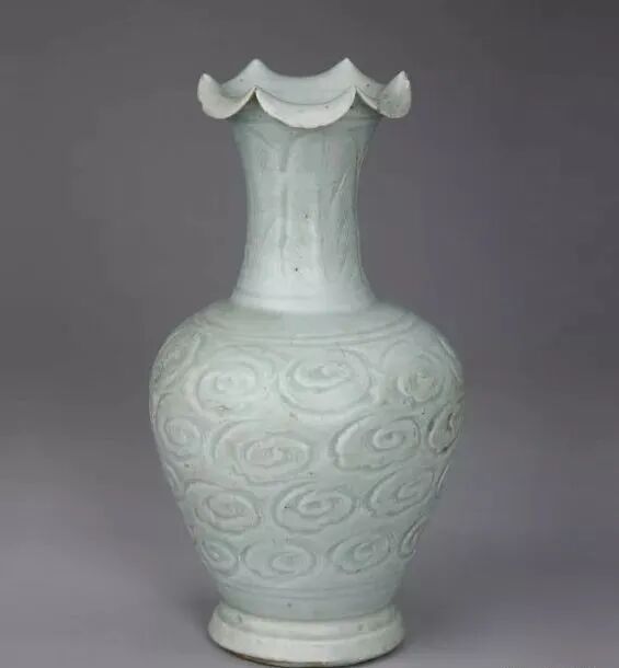 口外撇,呈六出花瓣沿,长颈,丰肩,斜直腹,圈足外撇。通体施影青釉,白中泛青,底无釉,胎体厚重。颈、肩及足上各刻弦纹二道,颈部饰四片蕉叶纹,腹满刻云朵纹。纹饰清晰、简练,繁而不乱。