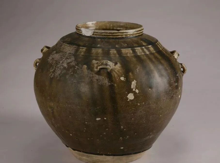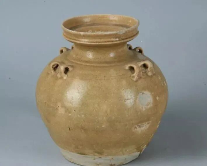 直口,束颈,丰肩,鼓腹,腹以下渐收呈平底。颈有二道凹弦纹,肩有一道凸弦纹和刻划水波纹。肩腹粘接明显。肩塑对称四个横形的米字纹桥型系和二个对称竖耳,腹有网纹。通体内外施青釉,釉厚而闪黄,外壁釉不到底,底面无釉,胎灰白。