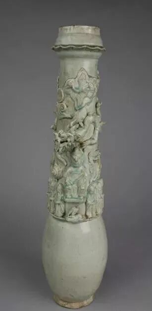敛口,口下出沿,长颈,鼓腹,矮圈足。通体施青白釉,白中泛青,釉里深处呈翠绿色。颈上端出沿处饰水波纹一周,颈身上部贴塑太阳、云纹、灵芝纹、龙凤纹。龙凤高高凸起近似圆雕。中部塑贴一主人在中间,两边分饰鹿、狗、灵芝。下部贴一周十二神王造像,中间跪卧一人。瓶身素面,有开片。圈足无釉,无盖。为一对,另一只不同点是二龙凤相对望,为明器。