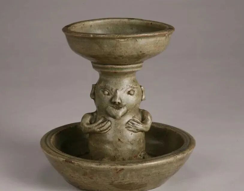 油盏、灯柱、承盘三部分构成。盏为唇口,口沿上点有四处褐色斑纹,弧腹,平底,立于人形灯柱头部的小盘上。灯柱为胡人像,鼓眼、高鼻、胡须,双手置放胸前,坐立在承盘中。承盘为敞口、弧腹、平底,口沿上有两道弦纹。人像背面有一孔,外底中间有一洞,两孔相通,散热、省油、实用。通体施青釉。
