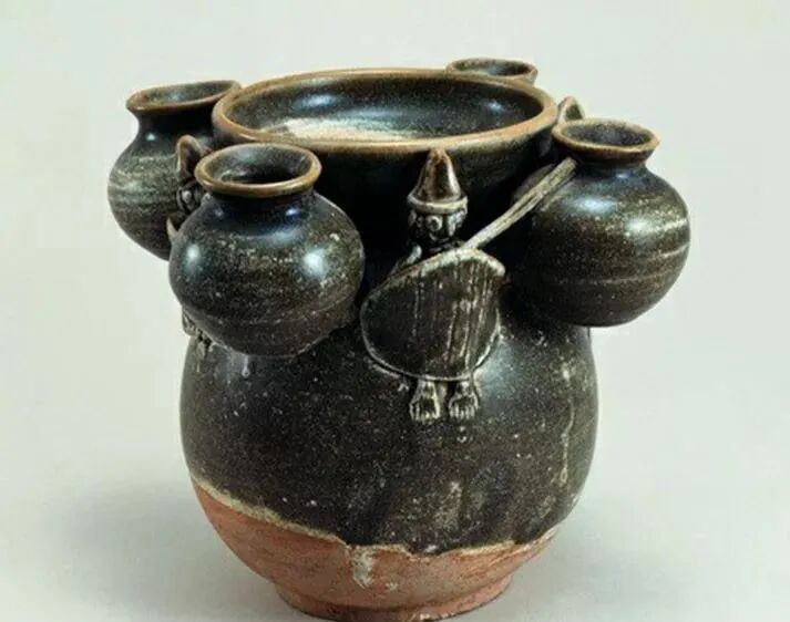盘口,束颈,鼓腹,圈足。中为一个拉坯成型的大圆罐,大罐的颈肩部贴塑与口齐平的四个壶形小罐,小罐之间塑有四胡人俑。大罐与小罐之间互不贯通。通体施青釉,釉色泛褐,外釉不到底,露出白色化妆土。全身无纹饰,整体造型简洁,贴塑工艺高超。2005年重庆市巫山文管所调拨。