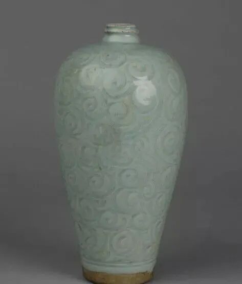 小口,短颈,丰肩,敛腹,卧足,瓶体修长。通体施青白釉,釉面均匀,有开片,釉不到底。 颈刻一道凸弦纹,肩及足各刻弦纹二道。瓶身通体用竹签刻划出主题纹饰云朵纹,瓶颈上的螺旋纹是用来上盖起密封作用,可知其为酒具。釉色青白晶莹,底无釉,缺盖。梅瓶为北宋创烧的一种瓶式,因口小仅容梅一枝而得名。又称“经瓶”。