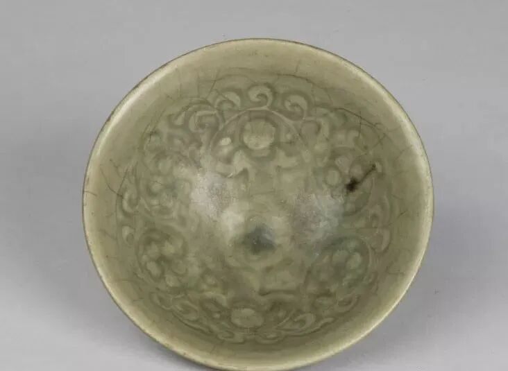 撇口,浅弧腹,腹下急收,矮圈足,外底鸡心。内外施青釉,釉色青中泛黄,有开片,底无釉。器内刻缠枝菊纹,花卉中对称饰有二童攀枝游荡。二童五官端正,小鼻小口,神情甜美。线条流畅,画意生动。