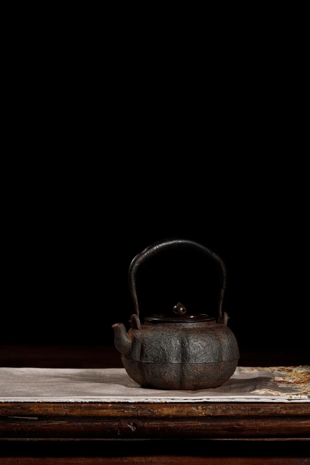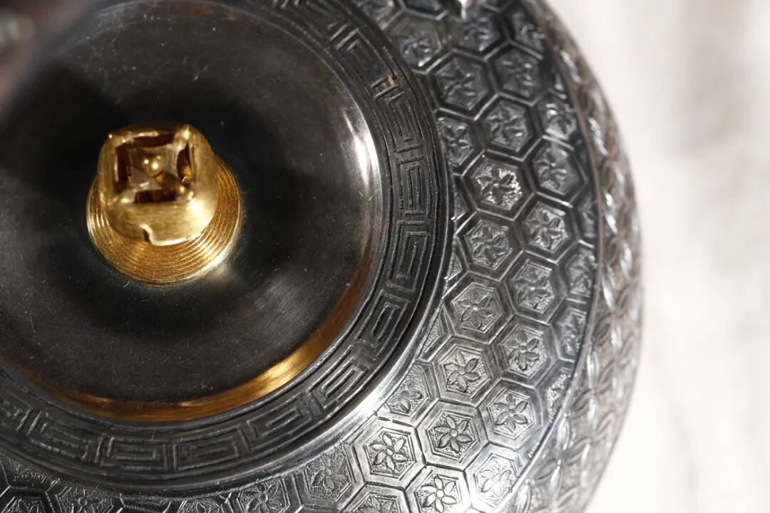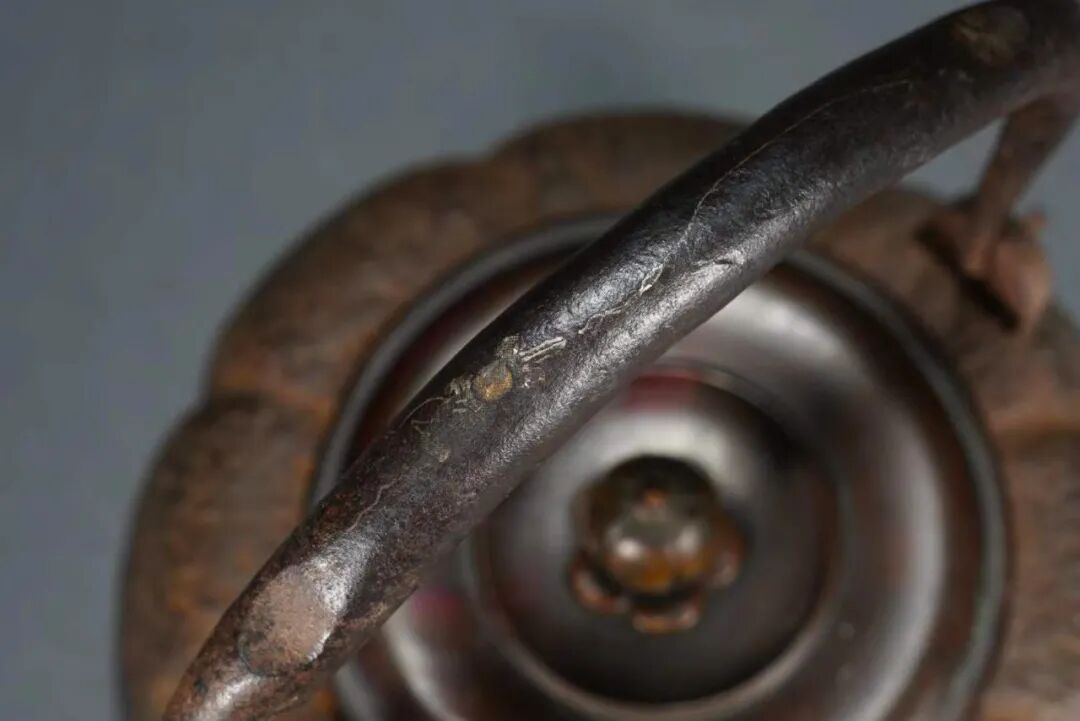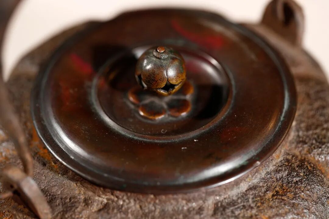 斑紫铜盖,配上镂空花苞摘钮,精巧雅致,妙趣横生,与壶身相得益彰。值得一提的是,铜质壶钮在日本也被称为“唐金盖”,铜在江户时期价格远远高于铁,拥有一把“唐金盖”铁壶,成了贵族彰显自己身份和财力的一种方式。
