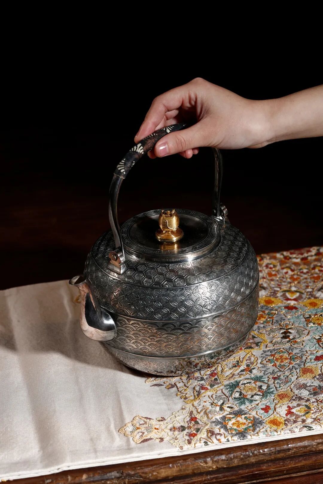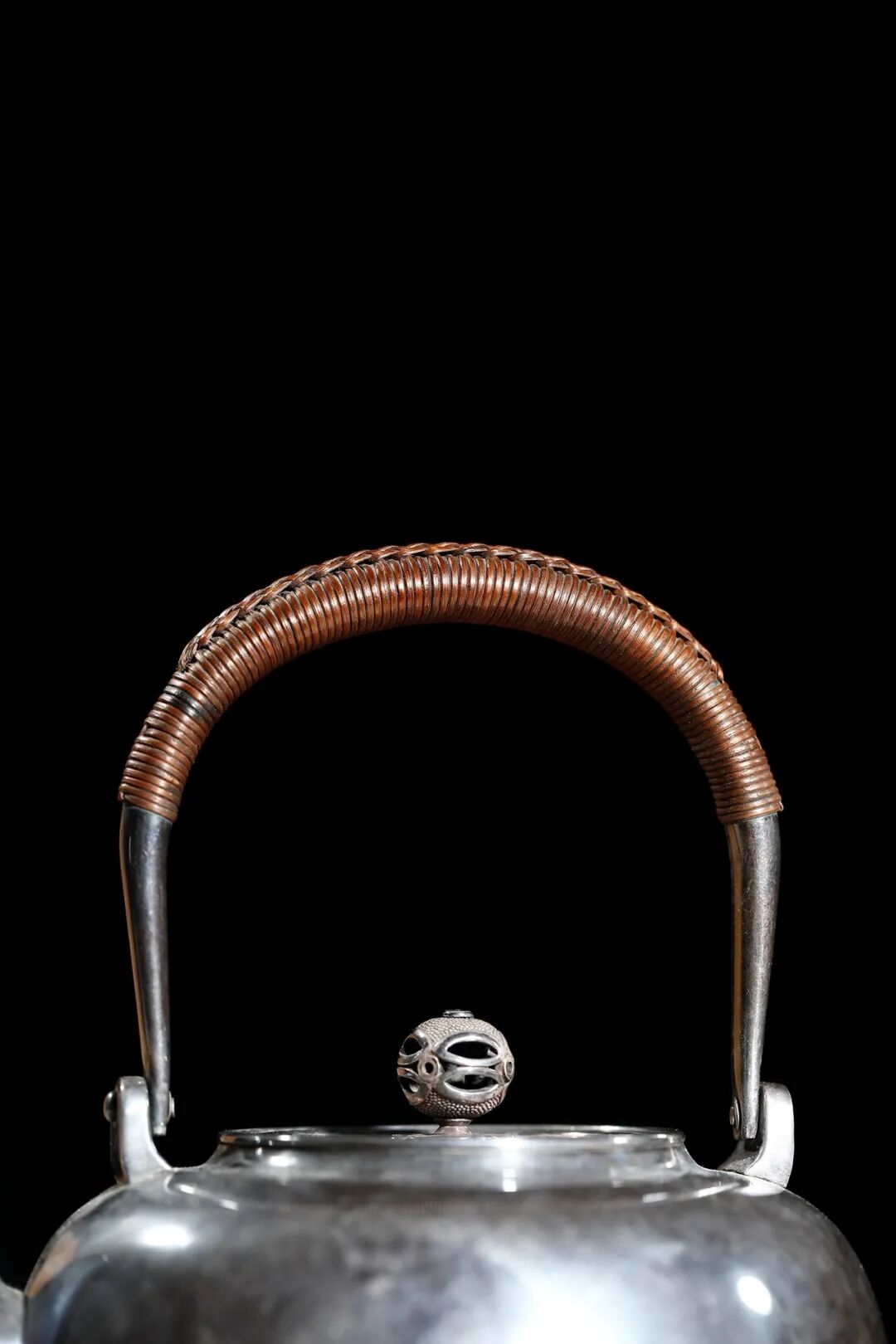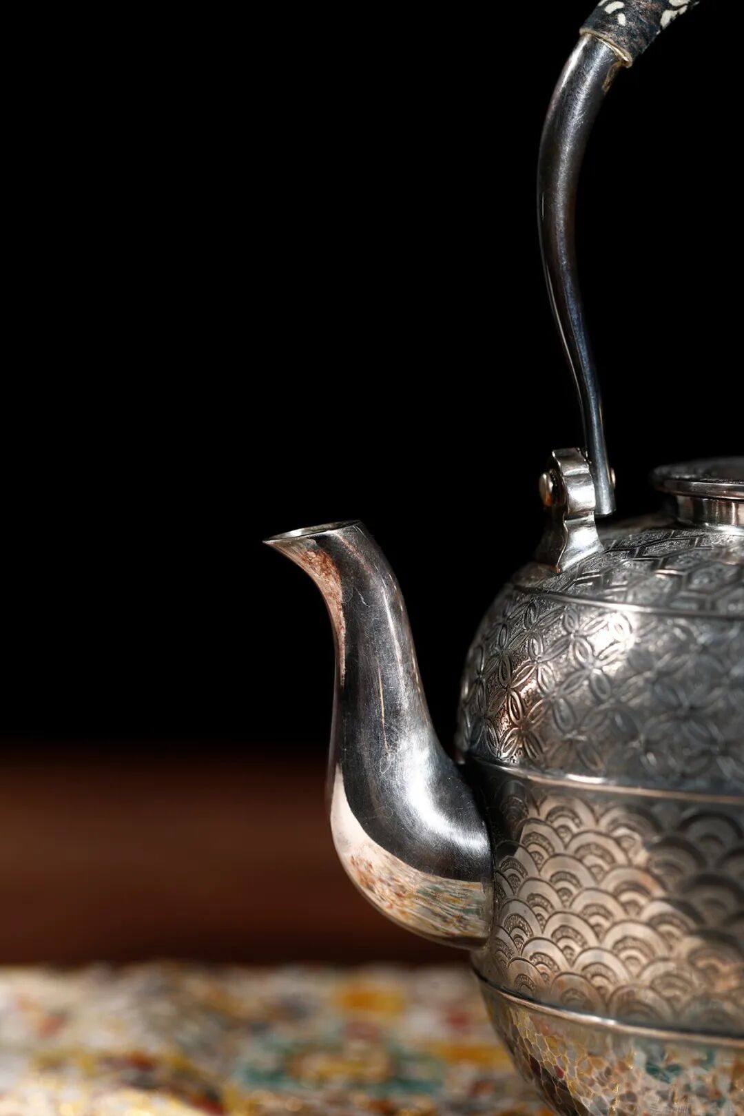 银壶煮水,可净尘。《茶经》中形容银器为”至洁“之物,便是说银器之”净“。