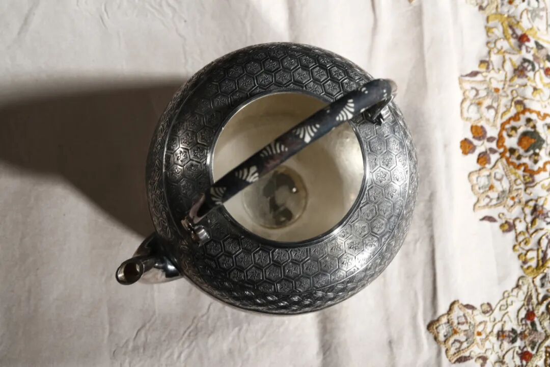 明治(1868-1912)·一晃斋金摘满刻纯银汤沸