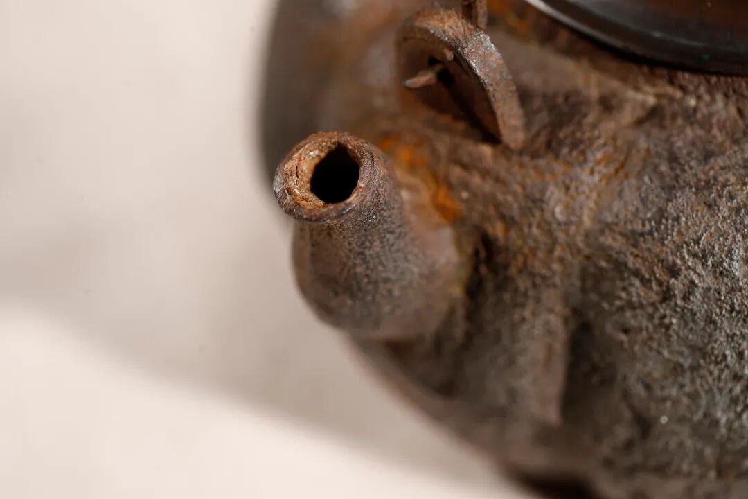 流嘴饱满而立体,水径通畅。整体古朴雅致,大气自然。壶底略有铁锈,岁月痕迹显。内部有响片,煮水时如有松涛之声,静中尤显。