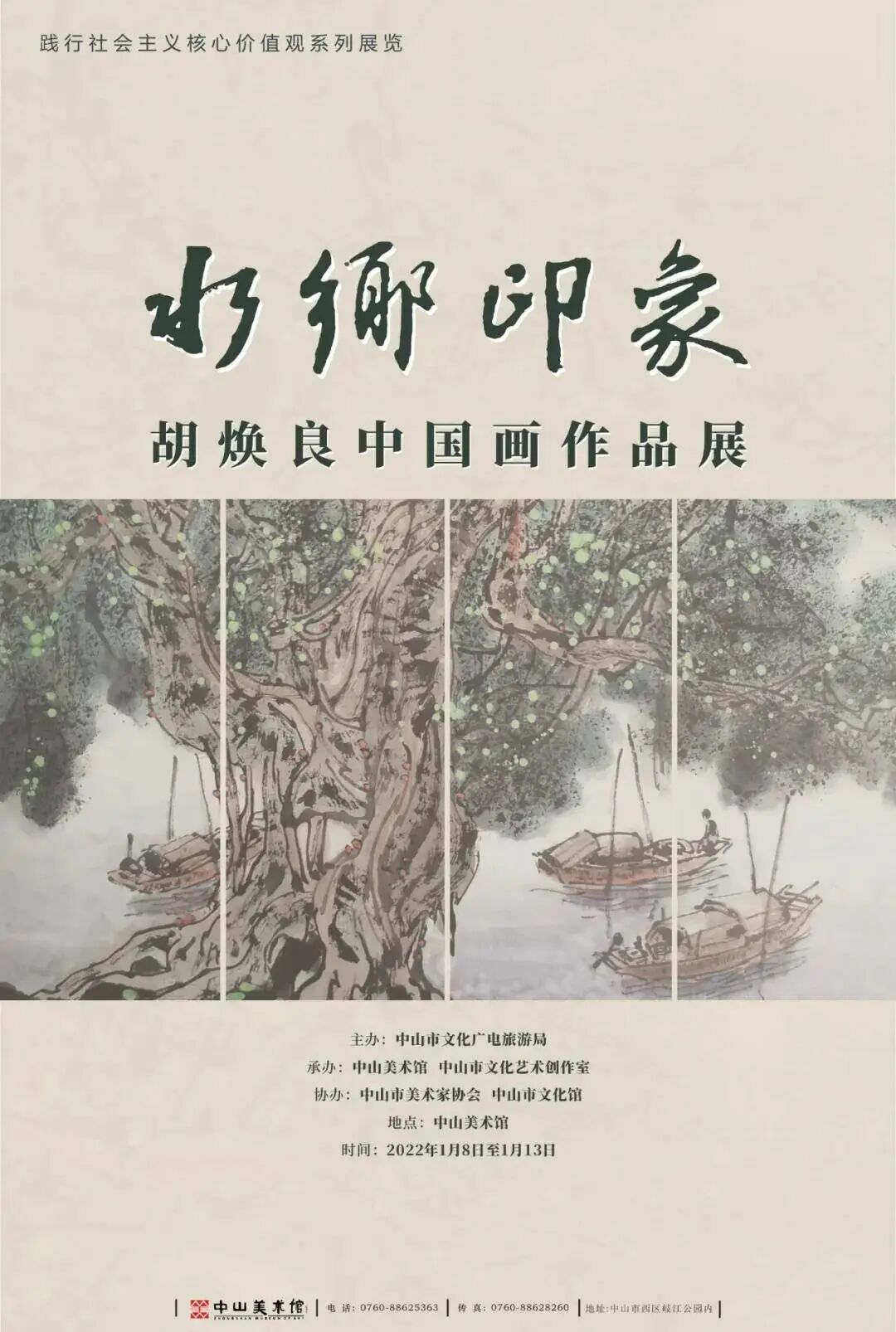 本次展览将展出胡焕良中国画作品60件,是一个回顾展,全面展示画家近五十年来艺术创作的成果。胡焕良的水乡画,构图平稳,明丽清雅,虚实相生,淳朴自然。在他的笔下,闲散觅食的鸡群、盛开的木棉、苍劲的古榕、停泊的舟楫、劳作的人们,以及小桥流水,都是那般的熟悉而亲切,绘出了中山美好的水乡风貌和幸福生活。