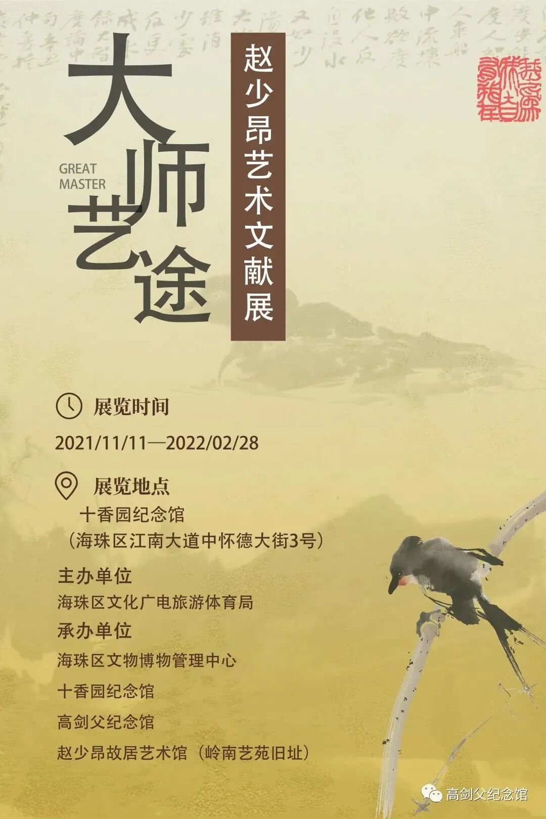 本次展览以赵少昂年表为线索,通过展出与其相关的珍贵文献、历史照片等,侧重从文献图纪的角度,去回眸画家赵少昂艺术的一生;同时,亦为今研究和学习者提供素材和鉴借。这也是十香园纪念馆继居巢、居廉后,第二次举办岭南画派大师资料文献展。展览时间:2021年11月11日—2022年2月28日展览地点:十香园纪念馆(海珠区江南大道中怀德大街3号)
