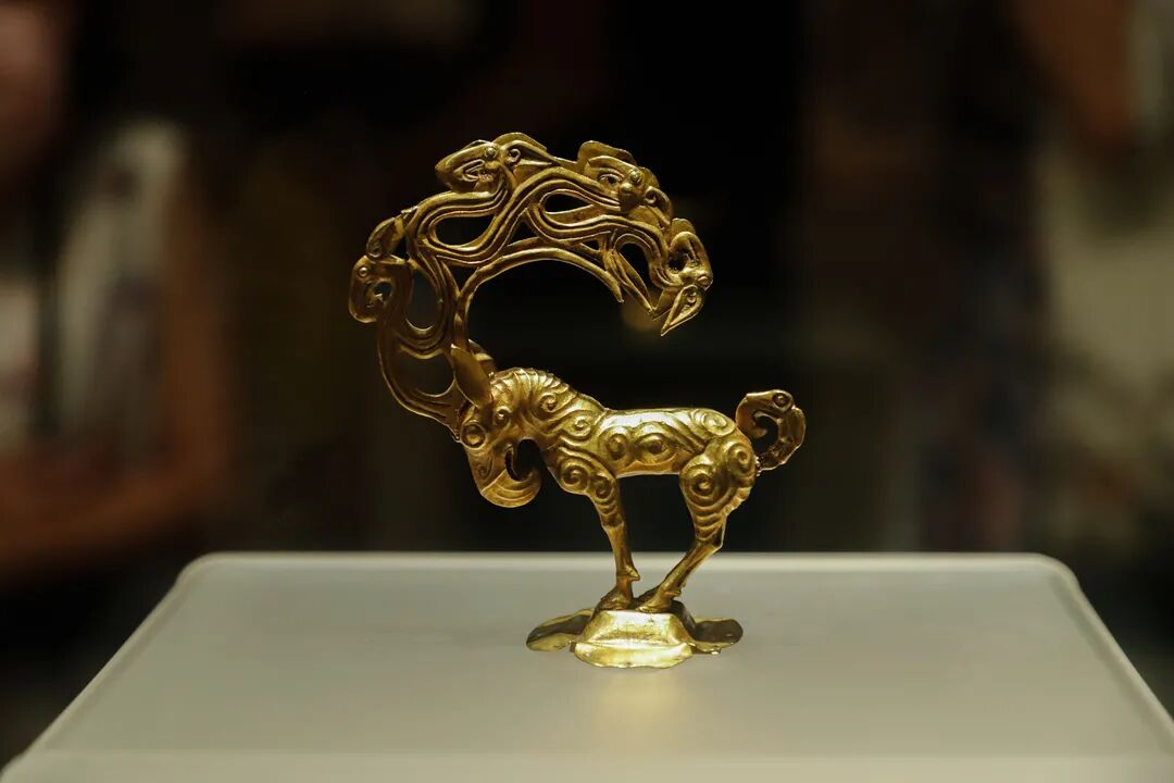 作品阐述:据专家考证,金怪兽应来自于匈奴,怪兽的两只角是由两身相连,背相对的16只小鸟组成,尾巴也是小鸟的样子,这件器物体现出工匠的巧妙构思和精湛做工。