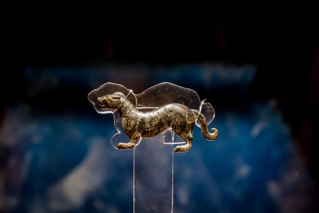 作品阐述:这件杜虎符正面突起如浮雕,虎身有错金铭文九行四十字。符是古代朝廷用于传达命令、调动军队的一种特殊凭证。通常作虎形,分为左右两半,右半符留在京师,左半符颁发给屯驻在外的军队。需调兵时,由朝廷使者持右半符前往,军队长官将右半符与左半符验合后,军队即按使者传达的命令行动。“杜虎符”实际是杜地的军事长官所用的兵符。