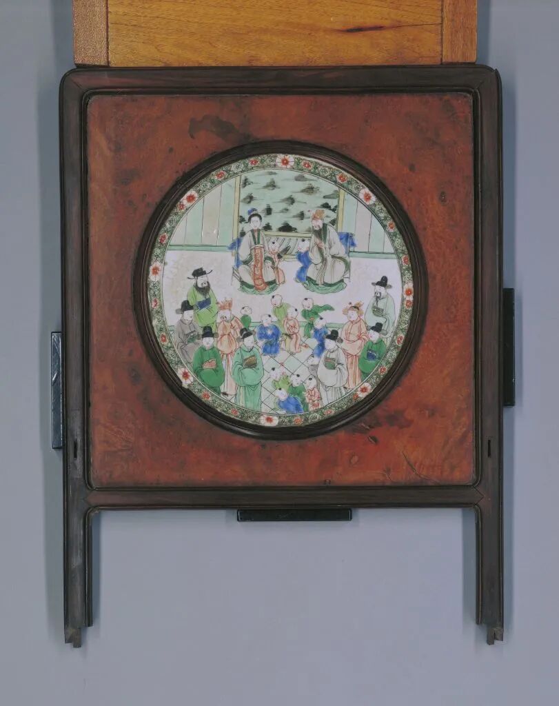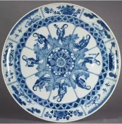 “饮中八仙”指唐代嗜酒的八位文人学士,亦称酒中八仙或醉八仙,他们是:贺知章、汝阳王李琎、李适之、崔宗之、苏晋、李白、张旭、焦遂。唐代诗人杜甫有《饮中八仙歌》,对他们各自的品行、性格作了淋漓尽致的描述。明清瓷器上的饮中八仙图,就是根据杜甫的诗绘制成的。伯牙,春秋时人,善弹琴。据《乐府解题》载:伯牙学琴于成连先生,三年不成。后随成连至东海蓬莱山,闻海水澎湃,群岛悲号之声,心有所感,乃援琴而歌,从此琴艺大进。与钟子期为友,所奏《高山流水》,曲意皆为钟之期悟出,世称知音。明清瓷品上绘有伯牙携琴访友图。以明成化图案最为精美,伯牙、琴童及所携之琴皆用青花勾勒,伯牙衣纹中填水绿彩,琴僮的衣服着矾红色。松树、野菊亦用青花绘成,枝叶加绿色,花着以黄彩。“鱼”与“余”同音,寓“富贵有余”、“连年有余”之意。宋代已具雏形,定窑、景德镇窑、吉州窑、龙泉窑、磁州窑的制品中均有范印或刻划的鱼纹,如:莲池游鱼、水波游鱼、水藻游鱼等。元代景德镇窑青花瓷器上的鱼藻纹十分精美,两尾游鱼之间,布满水藻、浮萍,并以水藻的漂拂示意水的流动。亦见磁州窑白地黑花品种。明清时期,景德镇窑彩瓷中的鱼纹更为繁多,常在同一器上画鲭、鲌、鲤、鳜四种鱼,鱼形较肥大,空间衬以水藻、浮萍、莲花等。《辛氏三春记》载:河津县(今山西省河津县)又叫龙门,因交通不便,水险浪高,河里的鱼鳖之类游不上去,凡是能跳过去的就称龙,故有鱼跳龙门的说法。民间故以此比喻科举金榜题名,飞黄腾达。明清瓷器上绘有此图。民间以和合为掌管婚姻的喜神,和合二仙并有“欢天喜地”的别称。人们图绘、模塑他们的形象,用来祝福“家庭和合,婚姻美满”。和合之像多在婚礼时陈列悬挂,或者常年悬挂在堂中,取谐好吉利之意。也有瓷器上绘荷花(和)、盒子(合)、灵芝(如意),象征“和合如意”。流行于清代。金玉满堂是形容财富极多。《老子》:“金玉满堂,莫之能守”。后又将金玉满堂称富有才学之人。《世说新语·赏誉》载:“王长史(王濛)谓林公(支遁),真长(刘惔)可为金玉满堂”。因鱼与玉音近,故清代瓷器以绘金鱼来比喻金玉满堂。鳌鱼,传说中的海大龟(鳖)。一说形似龙,好吞火,故立屋脊。亦名蛮蛤,好风雨,背负蓬莱之山于海中。唐、宋时期皇帝殿前陛阶上镌有巨鳌,翰林学士、承旨等官朝见皇帝时,立于陛阶正中,故称入翰林院为上鳌头。《玉壶清话》载:“座主登庸归凤阁,门生批诏立鳌头。”后称状元及第为独占鳌头。明清瓷器上绘有此图,以康熙制品为精。瓷器装饰题材。清康熙时颇为流行。内容有“西王母祝寿”、“福禄寿三星”、“八仙庆寿”、“万寿无疆”、“寿桃”、“双螭捧寿”、“莲花八宝托寿”等。