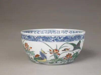 明斗彩折枝莲托八吉祥纹碗钟、磬、琴、萧、笙、埙、鼓柷[zhù]、圉[yǔ]八种乐器叫八音。八音也是中国古代对乐器的总称,指金、石、土、革、丝、木、匏、竹八类。《随园笔记·庄子天地篇》载:“华封人祝尧曰:‘使圣人福,使圣人寿,使圣人多男’。尧辞曰:‘多富则多事,多寿多辱,多男多累’”,九如:如山、如阜、如陵、如岗、如川之方至、如月之恒、如日之升、如松柏之荫、如南山之寿,也是祝颂之辞。常绘佛手、桃、石榴,喻多福(佛与福音近)、多寿、多子,绘九个如意指代“九如”,合称“三多九如”。“三羊开泰”谐音“三阳开泰”,“三阳开泰”本意是《周易》的“泰”卦,为最吉利的一卦,是以三阳爻开始的,象为,其意之所以吉利,是因其寓意“天地交而万类通,上下交而其志同。”
