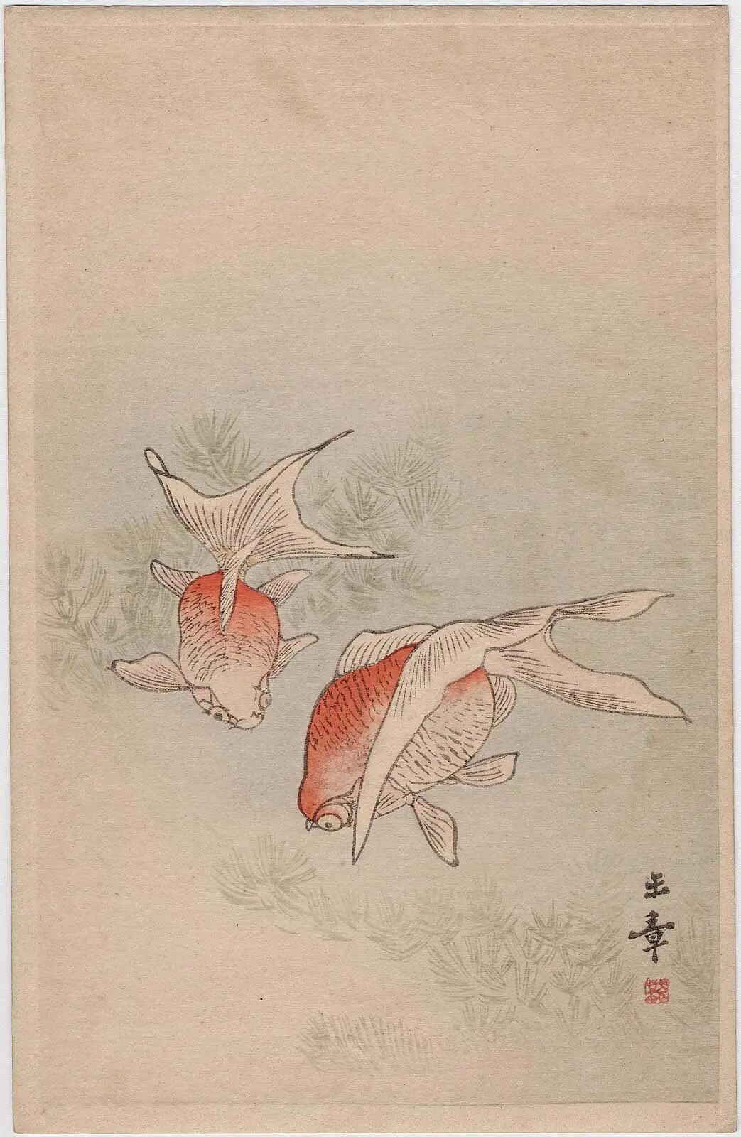 《金鱼》,川端玉章,日本,大正早期,彩色木刻版,彩色水墨印于卡纸上