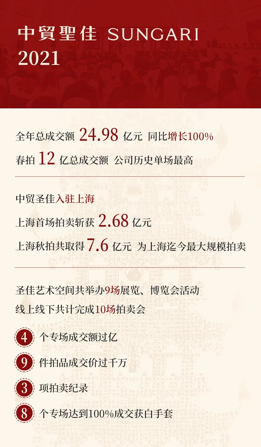 时光荏苒,如白驹过隙,2021稍纵即逝!这一年,我们依然在疫情的影响下砥砺前行,并在种种不确定因素下顺利完成了全年10场拍卖会。虽然秋拍调整了拍品结构,降低了拍品数量和预期,但在全体同事的共同努力下,依然超额完成了任务。全年24.98亿元的总成交额创中贸圣佳自1995年成立以来的历史新高,实现了新的突破!继中国嘉德、北京保利之后,中贸圣佳荣获2020年度北京地区营业税收及代交税收企业第三名。回首过往,感概万千,自2015年入行拍卖以来,经历诸多艰辛困惑,让我们深知唯有客户的信任才是生存之本,唯有坚守行业底线,才能赢得更多藏家的支持!过去、现在、未来,我们丝毫不敢懈怠,时时自省,与时俱进,力争在行业中处于不败之地。2022年,我们继续加油!在此,祝所有支持中贸圣佳的藏友们平安健康,新年快乐!