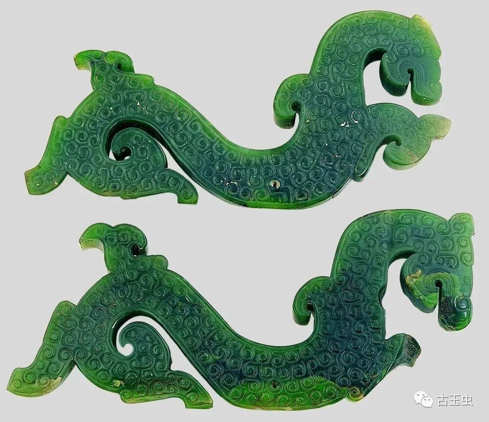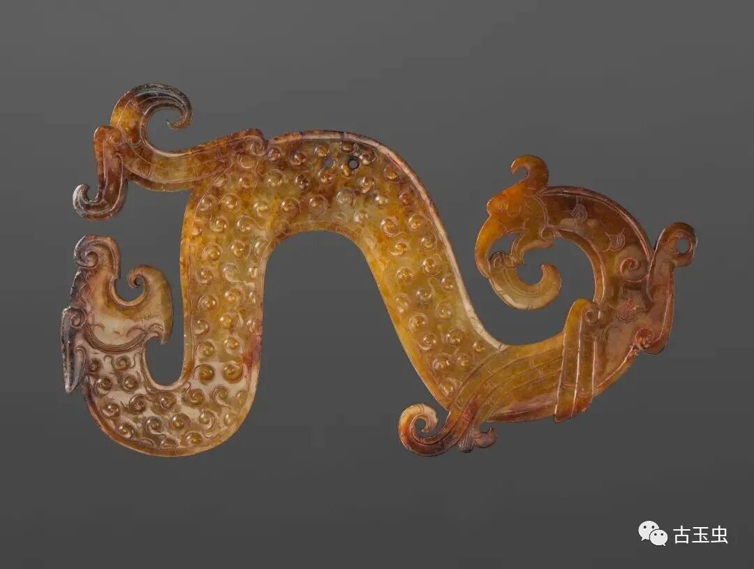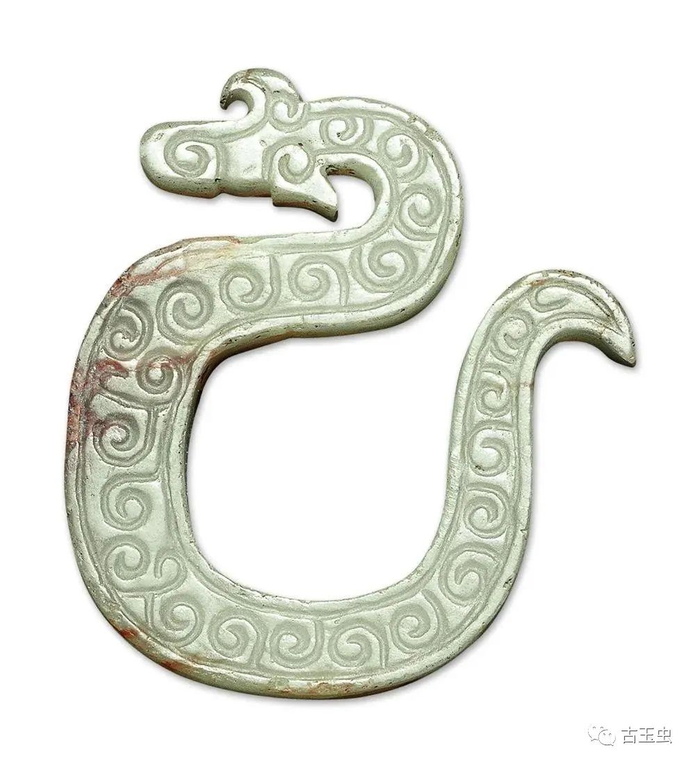 战国玉龙从造型上大致可分为独体玉龙和双首玉龙两种。其形状有璜形、玦形、螺旋形、S形、W形及有翼形几种。