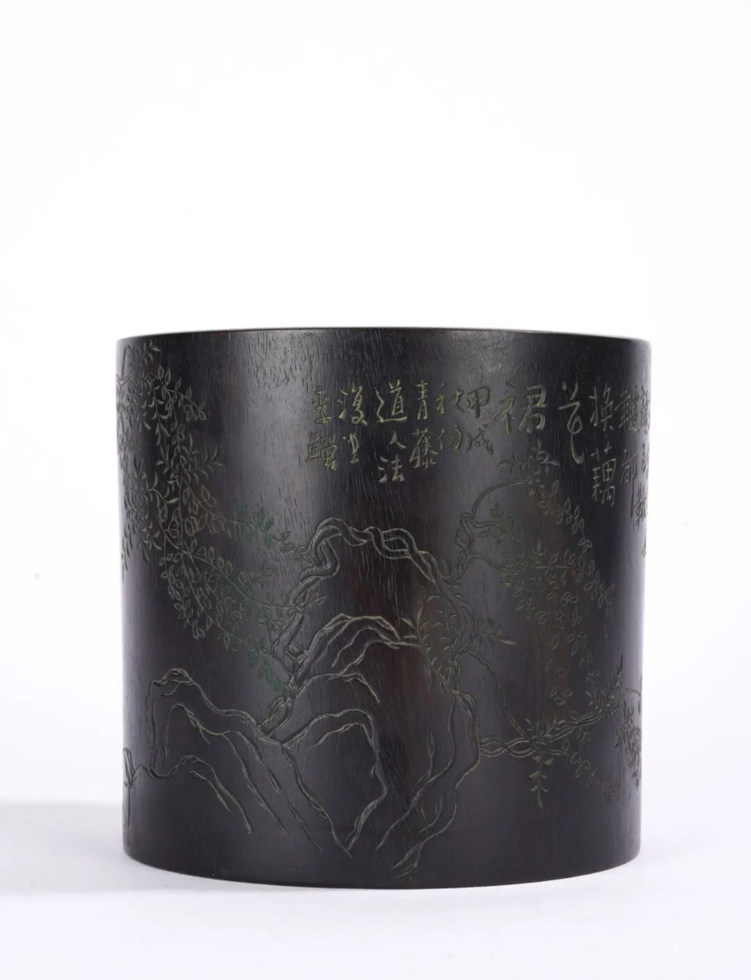 尺寸:5.0 cm x 2.0 cm x 7.5 cm尺寸:15.5 cm x 10.0 cm x 7.0 cmLot 1171 十八世纪 清中期 李鳝题 紫檀笔筒