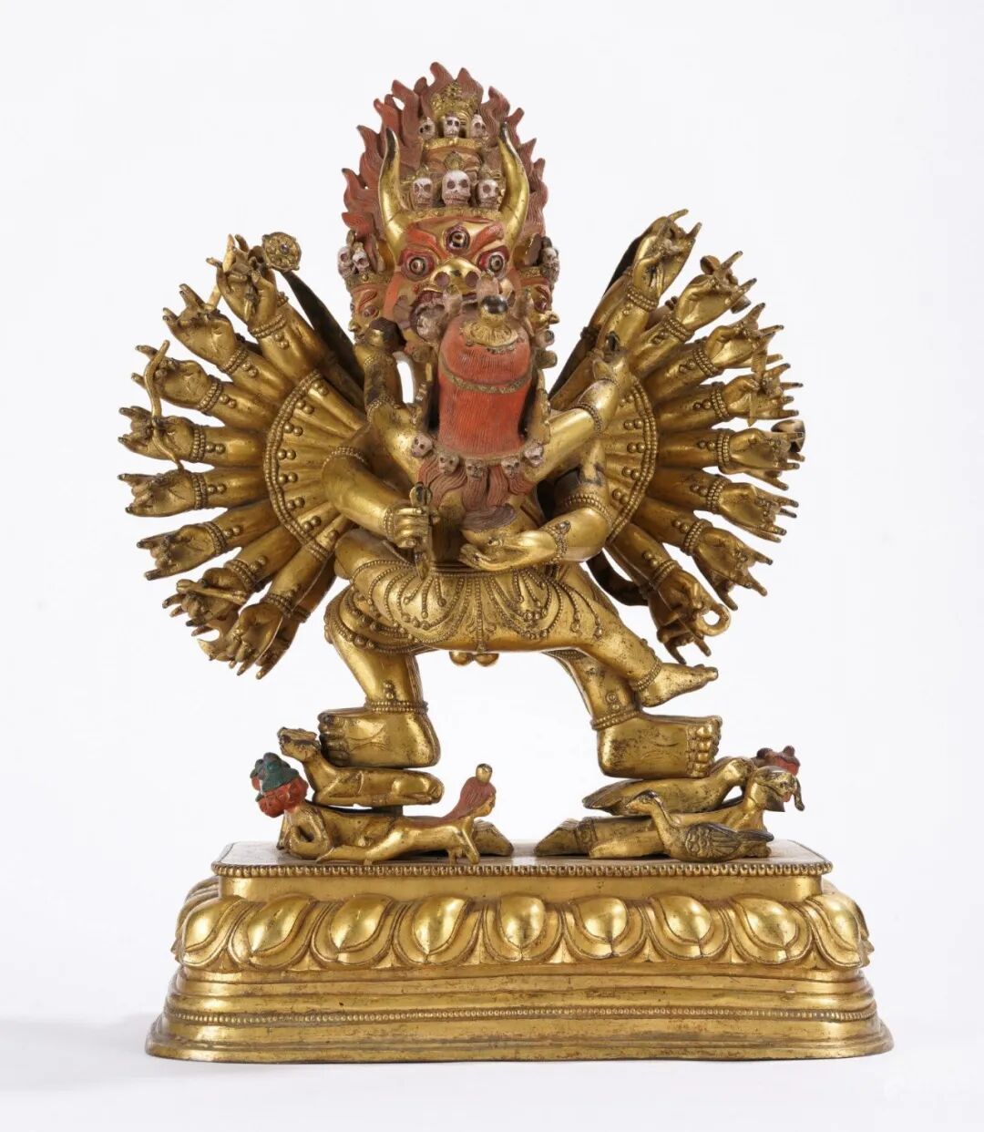 尺寸:H 12.0 cm,L 6.0 cm,W 27.5 cmLot 1413 十八世纪 乾隆时期 鎏金铜大威德金刚像