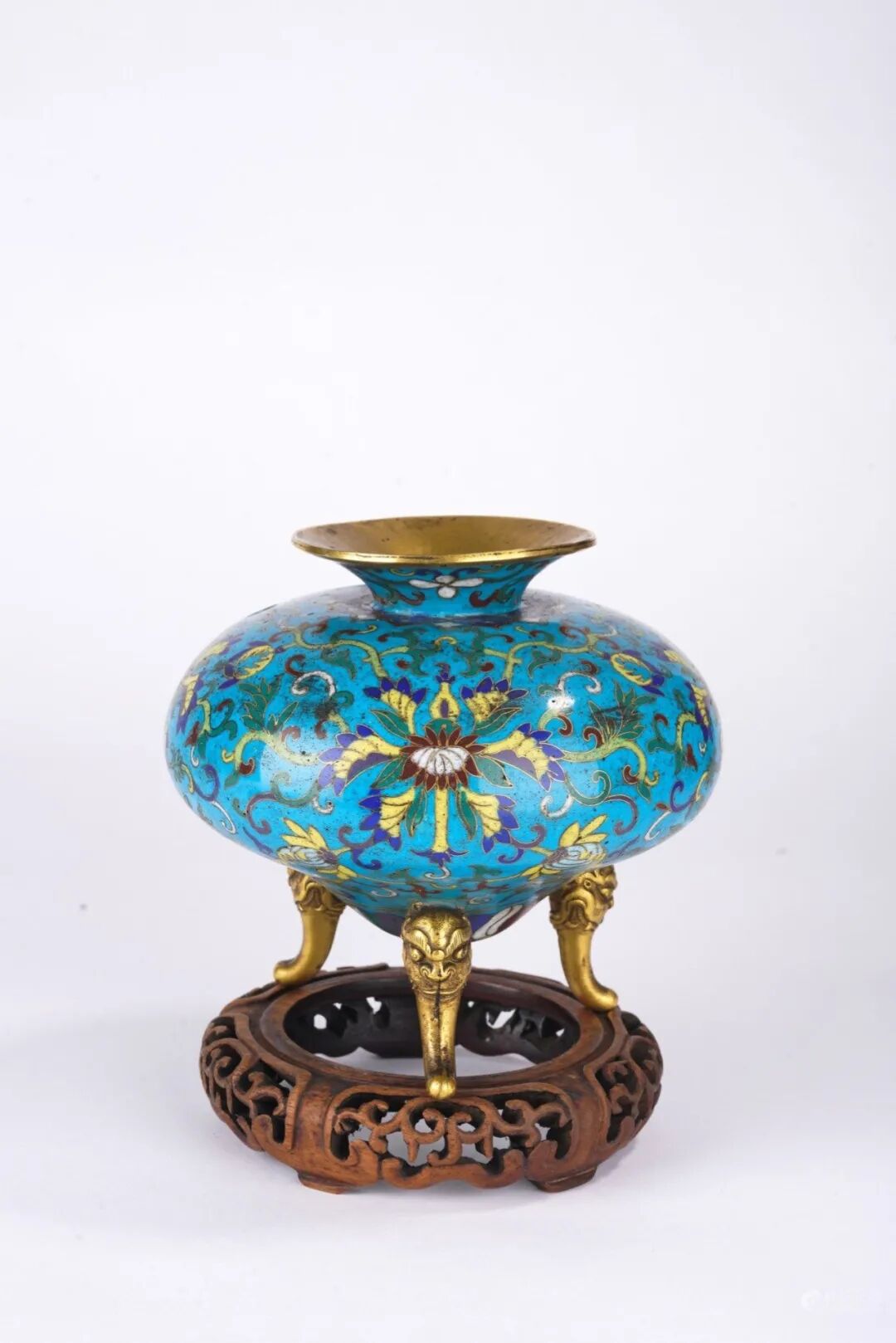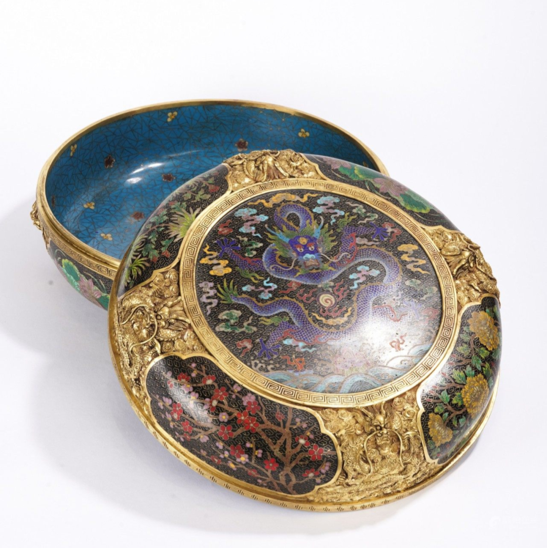 尺寸:H 48.0 cm,L 36.0 cm,W 37.0 cm来源:北加州核桃溪市莫尼森家族遗产。莫尼森夫妇为虔诚的藏传佛教徒, 自1977年起多次前往尼泊尔,印度等地交流,积累了可观的佛教艺术品收藏。莫尼森夫妇在2019年前后相继过世,藏品由其家族后人保存。来源:私人景泰蓝珐琅收藏,圣地亚哥。1970 年代购于纽约/新泽西。Lot 1501 十八世纪 掐丝珐琅鎏金铜龙纹捧盒