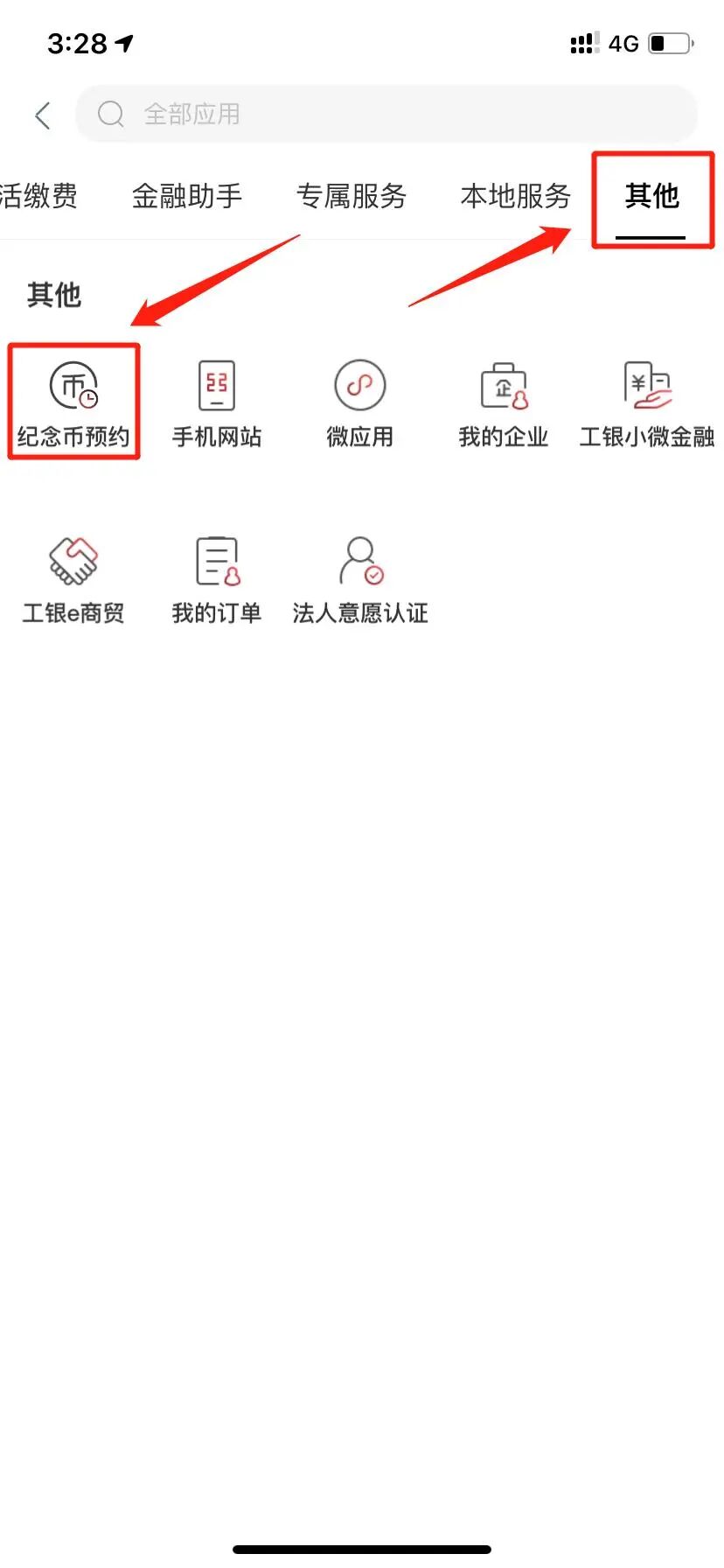 下载“中国工商银行”手机银行APP,依次点击全部-其他-纪念币预约,即可进入预约界面:
